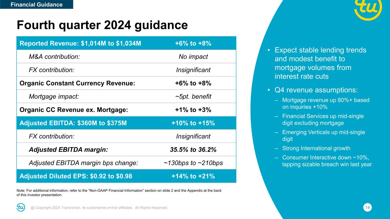 13@ Copyright 2024 TransUnion, its subsidiaries and/or affiliates. All Rights Reserved. 1We define Leverage Ratio as net debt divided by Consolidated Adjusted EBITDA for the most recent twelve-month period including twelve months of Adjusted EBITDA from significant acquisitions. Net debt is defined as total debt less cash and cash equivalents as reported on the balance sheet as of the end of the period. Total debt is netted for deferred financing fees / original issue discount. Note: For additional information, refer to the “Non-GAAP Financial Information” section on slide 2 and the Appendix at the back of this investor presentation. Excess cash targeted for debt prepayment Leverage Ratio1 4.3x 3.9x 3.4x 3.1x 4.1x 3.5x 3.1x 3.5x 3.8x 3.6x 3.1x ~3x <3.0x 2015 IPO 2015 2016 2017 2018 2019 2020 2021 2022 2023 Q3 2024 YE 2024 Target Balance Sheet • Roughly $5.2 billion of debt and $643 million cash at quarter-end • $25 million debt prepayment in Q3; $105 million year-to- date • Average effective cost of debt (net of swaps) of 4.7%, below current SOFR