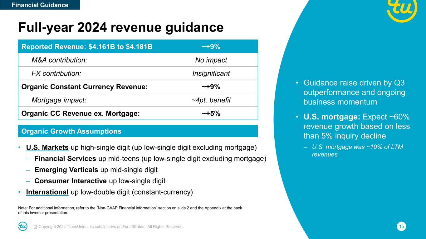 14@ Copyright 2024 TransUnion, its subsidiaries and/or affiliates. All Rights Reserved. Reported Revenue: $1,014M to $1,034M +6% to +8% M&A contribution: No impact FX contribution: Insignificant Organic Constant Currency Revenue: +6% to +8% Mortgage impact: ~5pt. benefit Organic CC Revenue ex. Mortgage: +1% to +3% Adjusted EBITDA: $360M to $375M +10% to +15% FX contribution: Insignificant Adjusted EBITDA margin: 35.5% to 36.2% Adjusted EBITDA margin bps change: ~130bps to ~210bps Adjusted Diluted EPS: $0.92 to $0.98 +14% to +21% Note: For additional information, refer to the “Non-GAAP Financial Information” section on slide 2 and the Appendix at the back of this investor presentation. Fourth quarter 2024 guidance • Expect stable lending trends and modest benefit to mortgage volumes from interest rate cuts • Q4 revenue assumptions: – Mortgage revenue up 80%+ based on inquiries +10% – Financial Services up mid-single digit excluding mortgage – Emerging Verticals up mid-single digit – Strong International growth – Consumer Interactive down ~10%, lapping sizable breach win last year Note: For additional information, refer to the “Non-GAAP Financial Information” section on slide 2 and the Appendix at the back of this investor presentation. Financial Guidance