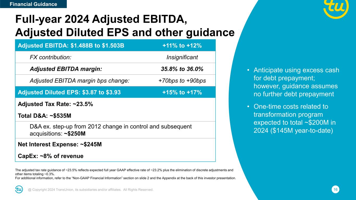 15@ Copyright 2024 TransUnion, its subsidiaries and/or affiliates. All Rights Reserved. • Guidance raise driven by Q3 outperformance and ongoing business momentum • U.S. mortgage: Expect ~60% revenue growth based on less than 5% inquiry decline – U.S. mortgage was ~10% of LTM revenues Note: For additional information, refer to the “Non-GAAP Financial Information” section on slide 2 and the Appendix at the back of this investor presentation. Full-year 2024 revenue guidance Reported Revenue: $4.161B to $4.181B ~+9% M&A contribution: No impact FX contribution: Insignificant Organic Constant Currency Revenue: ~+9% Mortgage impact: ~4pt. benefit Organic CC Revenue ex. Mortgage: ~+5% Organic Growth Assumptions • U.S. Markets up high-single digit (up low-single digit excluding mortgage) – Financial Services up mid-teens (up low-single digit excluding mortgage) – Emerging Verticals up mid-single digit – Consumer Interactive up low-single digit • International up low-double digit (constant-currency) Note: For additional information, refer to the “Non-GAAP Financial Information” section on slide 2 and the Appendix at the back of this investor presentation. Financial Guidance