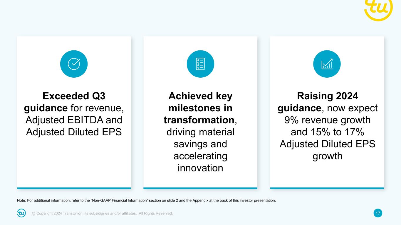16@ Copyright 2024 TransUnion, its subsidiaries and/or affiliates. All Rights Reserved. The adjusted tax rate guidance of ~23.5% reflects expected full year GAAP effective rate of ~23.2% plus the elimination of discrete adjustments and other items totaling ~0.3%. For additional information, refer to the “Non-GAAP Financial Information” section on slide 2 and the Appendix at the back of this investor presentation. Full-year 2024 Adjusted EBITDA, Adjusted Diluted EPS and other guidance Adjusted EBITDA: $1.488B to $1.503B +11% to +12% FX contribution: Insignificant Adjusted EBITDA margin: 35.8% to 36.0% Adjusted EBITDA margin bps change: +70bps to +90bps Adjusted Diluted EPS: $3.87 to $3.93 +15% to +17% Adjusted Tax Rate: ~23.5% Total D&A: ~$535M D&A ex. step-up from 2012 change in control and subsequent acquisitions: ~$250M Net Interest Expense: ~$245M CapEx: ~8% of revenue • Anticipate using excess cash for debt prepayment; however, guidance assumes no further debt prepayment • One-time costs related to transformation program expected to total ~$200M in 2024 ($145M year-to-date) Financial Guidance