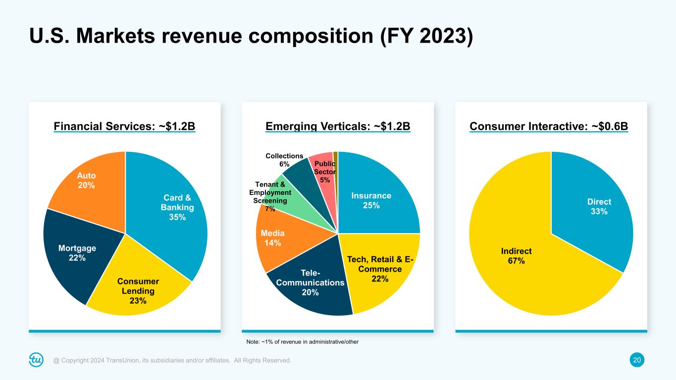 20@ Copyright 2024 TransUnion, its subsidiaries and/or affiliates. All Rights Reserved. U.S. Markets revenue composition (FY 2023) Financial Services: ~$1.2B Emerging Verticals: ~$1.2B Consumer Interactive: ~$0.6B Card & Banking 35% Consumer Lending 23% Mortgage 22% Auto 20% Insurance 25% Tech, Retail & E- Commerce 22%Tele- Communications 20% Media 14% Tenant & Employment Screening 7% Collections 6% Public Sector 5% Direct 33% Indirect 67% Note: ~1% of revenue in administrative/other
