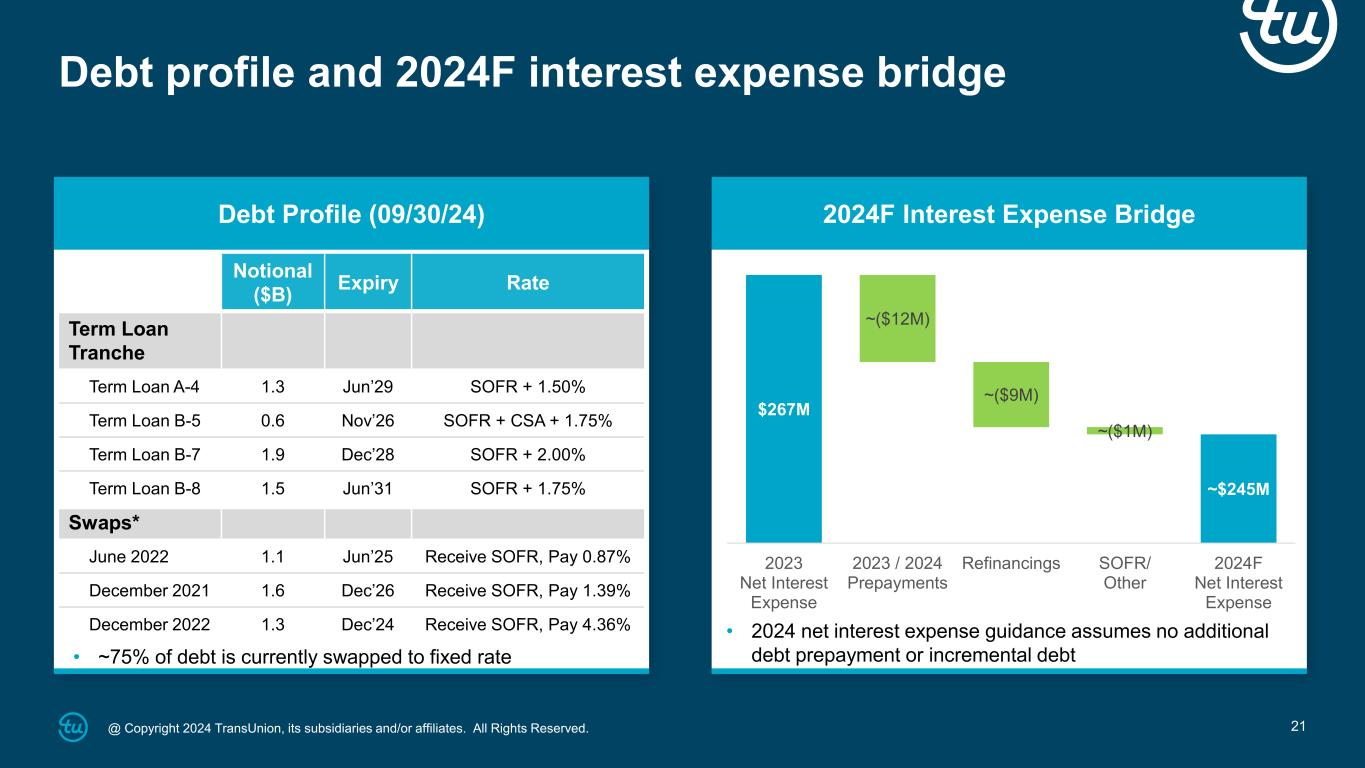 @ Copyright 2024 TransUnion, its subsidiaries and/or affiliates. All Rights Reserved. 21 Debt profile and 2024F interest expense bridge Debt Profile (09/30/24) 2024F Interest Expense Bridge Notional ($B) Expiry Rate Term Loan Tranche Term Loan A-4 1.3 Jun’29 SOFR + 1.50% Term Loan B-5 0.6 Nov’26 SOFR + CSA + 1.75% Term Loan B-7 1.9 Dec’28 SOFR + 2.00% Term Loan B-8 1.5 Jun’31 SOFR + 1.75% Swaps* June 2022 1.1 Jun’25 Receive SOFR, Pay 0.87% December 2021 1.6 Dec’26 Receive SOFR, Pay 1.39% December 2022 1.3 Dec’24 Receive SOFR, Pay 4.36% • ~75% of debt is currently swapped to fixed rate • 2024 net interest expense guidance assumes no additional debt prepayment or incremental debt $267M ~$245M ~($12M) ~($9M) ~($1M) 2023 Net Interest Expense 2023 / 2024 Prepayments Refinancings SOFR/ Other 2024F Net Interest Expense