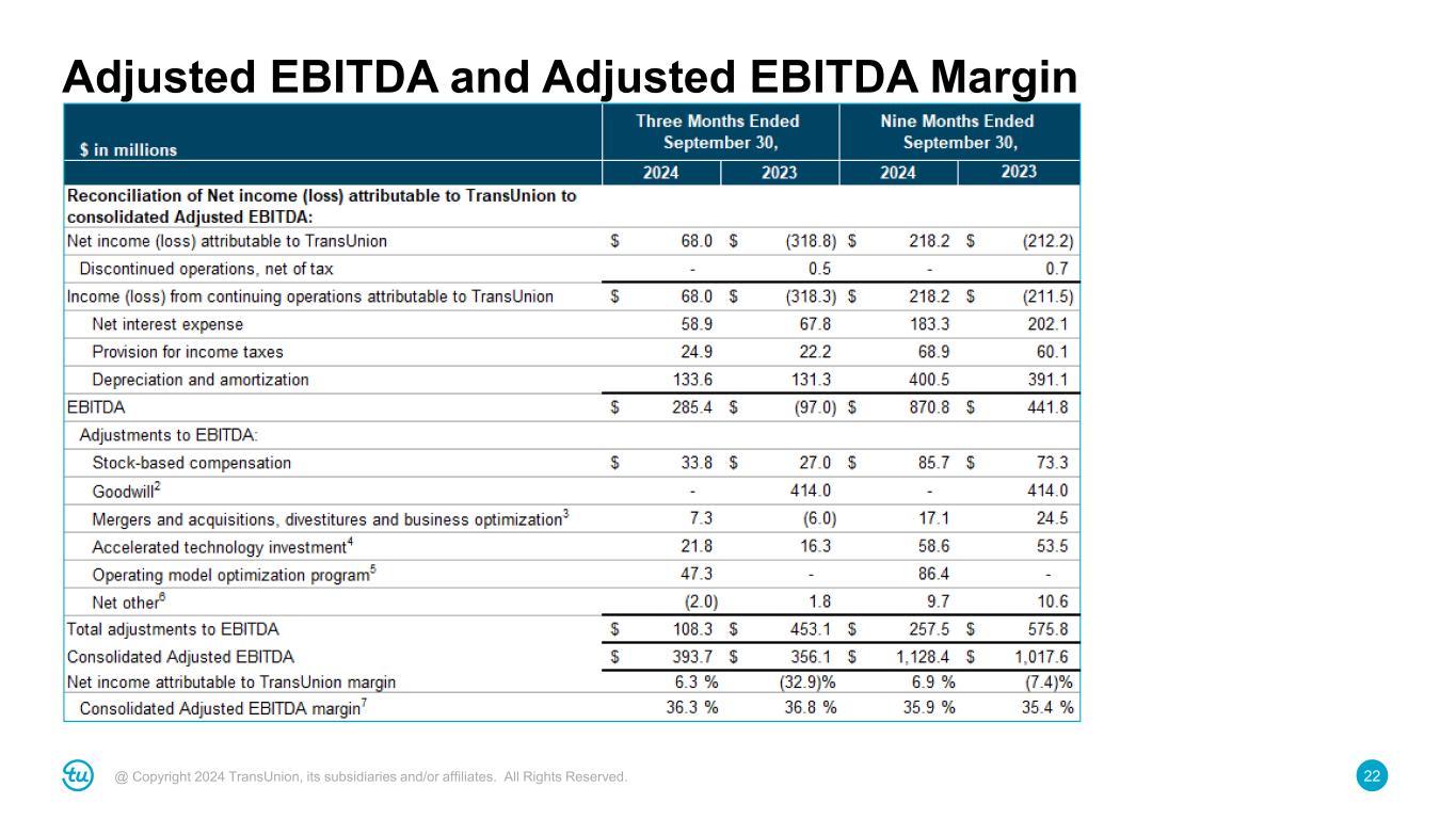 22@ Copyright 2024 TransUnion, its subsidiaries and/or affiliates. All Rights Reserved. Adjusted EBITDA and Adjusted EBITDA Margin