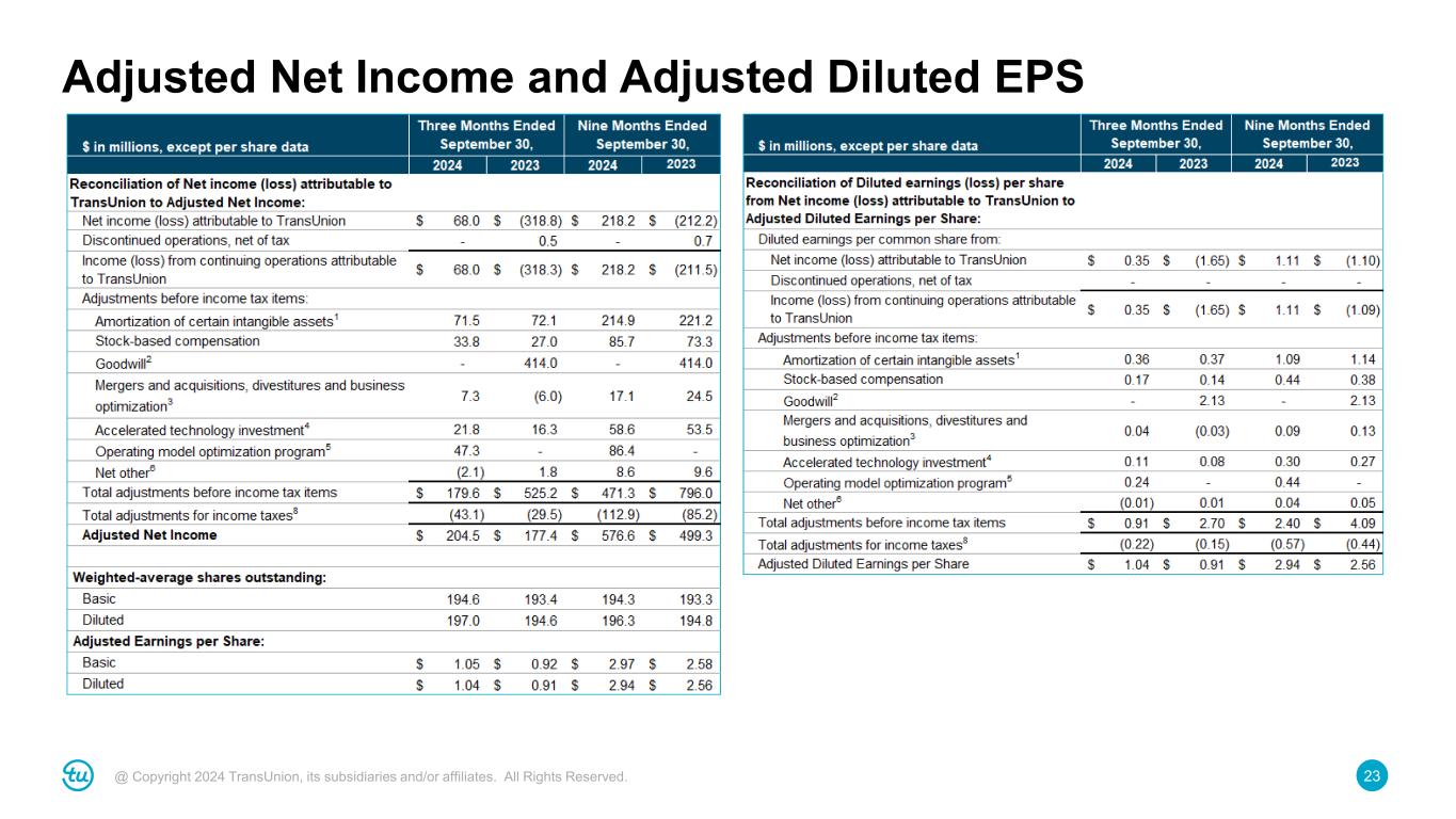 23@ Copyright 2024 TransUnion, its subsidiaries and/or affiliates. All Rights Reserved. Adjusted Net Income and Adjusted Diluted EPS