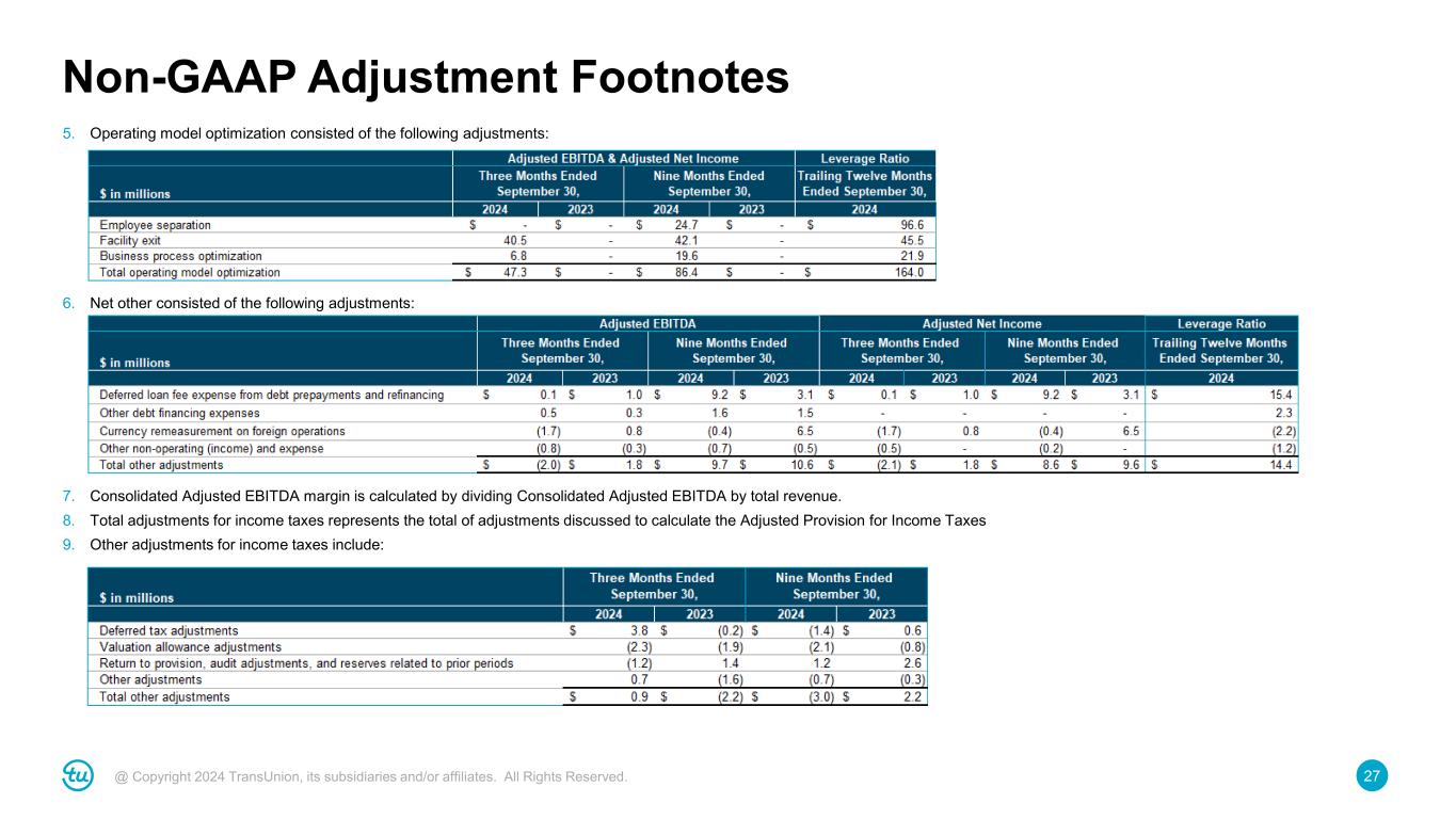 26@ Copyright 2024 TransUnion, its subsidiaries and/or affiliates. All Rights Reserved. Non-GAAP Adjustment Footnotes As a result of displaying amounts in millions, rounding differences may exist in the tables and footnotes. 1. Consisted of amortization of intangible assets from our 2012 change-in-control transaction and amortization of intangible assets established in business acquisitions after our 2012 change-in-control transaction. 2. During the quarter ended September 30, 2023, we recorded a goodwill impairment of $414.0 million related to our United Kingdom reporting unit in our International segment. 3. Mergers and acquisitions, divestitures and business optimization consisted of the following adjustments: 4. Represents expenses associated with our accelerated technology investment to migrate to the cloud. There are three components of the accelerated technology investment: (i) building foundational capabilities which includes establishing a modern, API-based and services- oriented software architecture, (ii) the migration of each application and customer data to the new enterprise platform, including the redundant software costs during the migration period, as well as the efforts to decommission the legacy system, and (iii) program enablement, which includes dedicated resources to support the planning and execution of the program. The amounts for each category of cost are as follows: