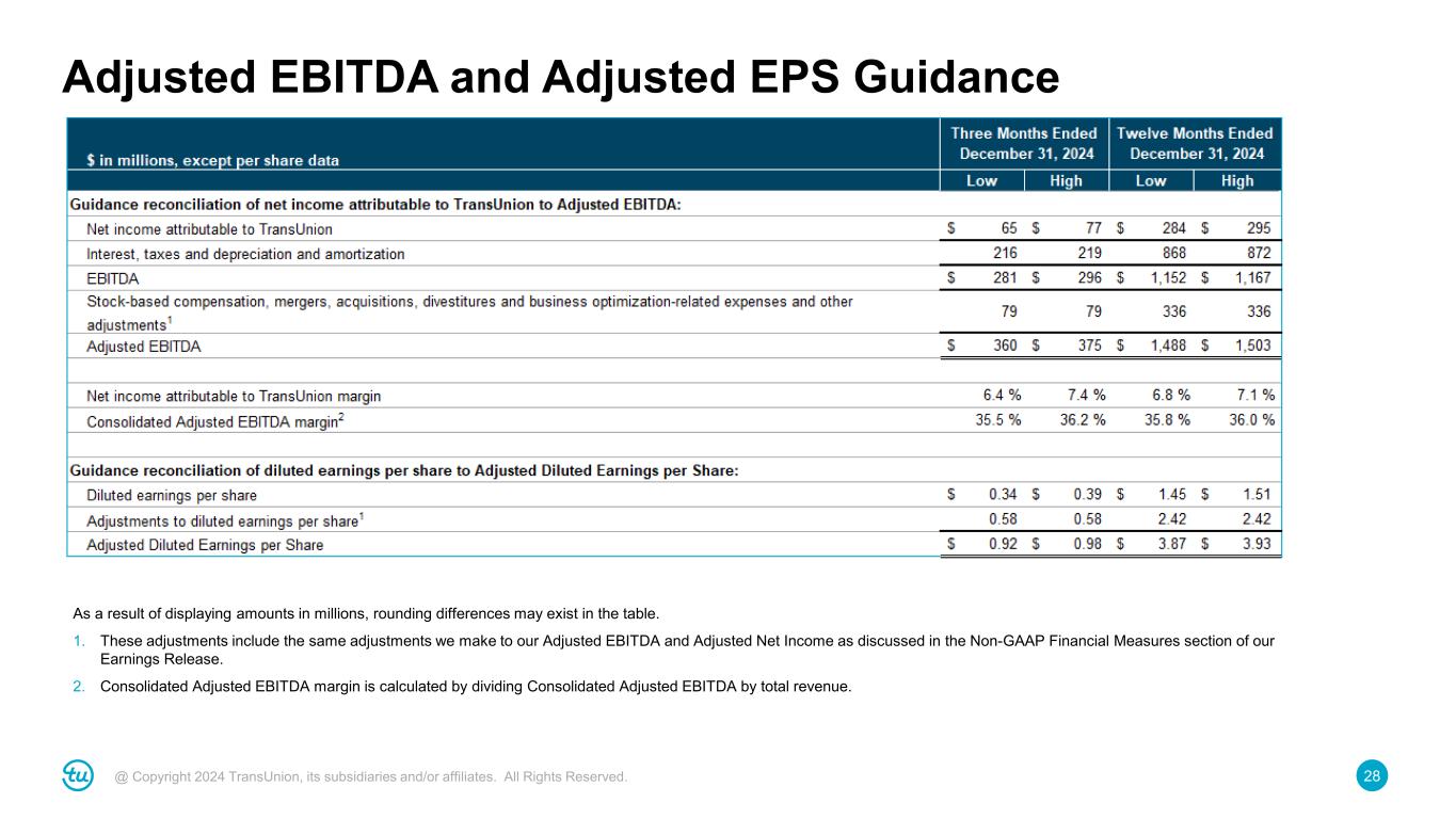 27@ Copyright 2024 TransUnion, its subsidiaries and/or affiliates. All Rights Reserved. Non-GAAP Adjustment Footnotes 5. Operating model optimization consisted of the following adjustments: 6. Net other consisted of the following adjustments: 7. Consolidated Adjusted EBITDA margin is calculated by dividing Consolidated Adjusted EBITDA by total revenue. 8. Total adjustments for income taxes represents the total of adjustments discussed to calculate the Adjusted Provision for Income Taxes 9. Other adjustments for income taxes include: