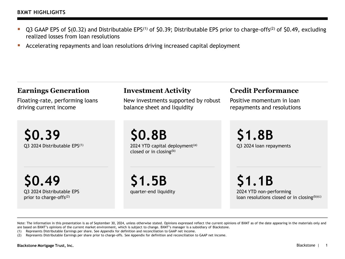 Blackstone |Blackstone Mortgage Trust, Inc. BXMT HIGHLIGHTS Note: The information in this presentation is as of September 30, 2024, unless otherwise stated. Opinions expressed reflect the current opinions of BXMT as of the date appearing in the materials only and are based on BXMT’s opinions of the current market environment, which is subject to change. BXMT’s manager is a subsidiary of Blackstone. (1) Represents Distributable Earnings per share. See Appendix for definition and reconciliation to GAAP net income. (2) Represents Distributable Earnings per share prior to charge-offs. See Appendix for definition and reconciliation to GAAP net income. 1 ▪ Q3 GAAP EPS of $(0.32) and Distributable EPS(1) of $0.39; Distributable EPS prior to charge-offs(2) of $0.49, excluding realized losses from loan resolutions ▪ Accelerating repayments and loan resolutions driving increased capital deployment Earnings Generation Floating-rate, performing loans driving current income Investment Activity New investments supported by robust balance sheet and liquidity $1.5B quarter-end liquidity Credit Performance Positive momentum in loan repayments and resolutions $1.8B Q3 2024 loan repayments $1.1B 2024 YTD non-performing loan resolutions closed or in closing(b)(c) $0.49 Q3 2024 Distributable EPS prior to charge-offs(2) $0.39 Q3 2024 Distributable EPS(1) $0.8B 2024 YTD capital deployment(a) closed or in closing(b)