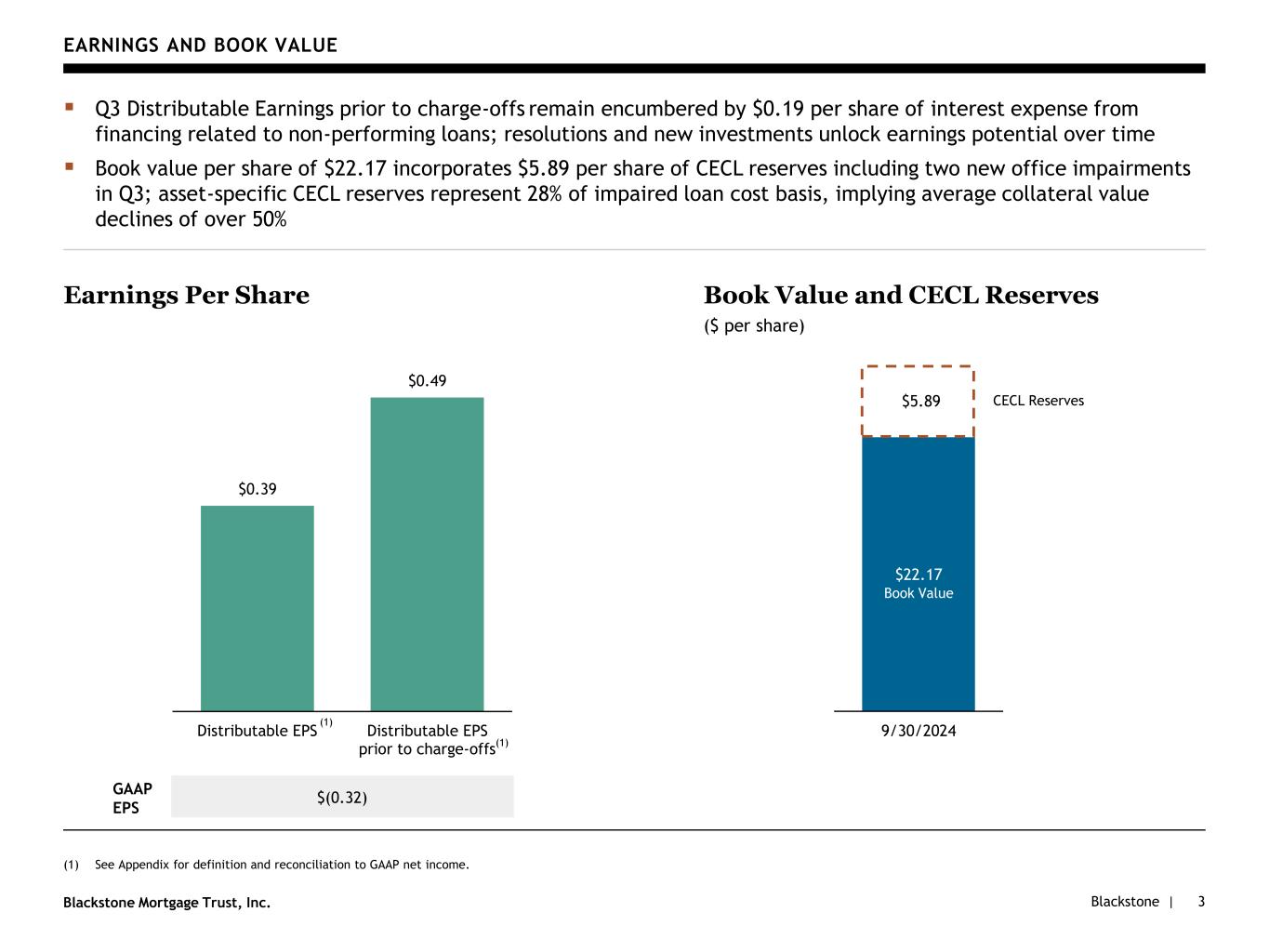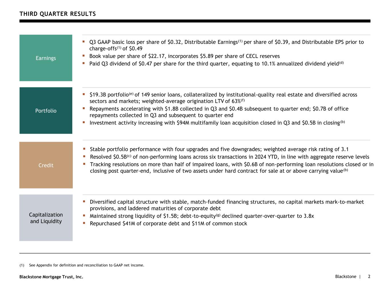 Blackstone |Blackstone Mortgage Trust, Inc. THIRD QUARTER RESULTS (1) See Appendix for definition and reconciliation to GAAP net income. 2 ▪ Q3 GAAP basic loss per share of $0.32, Distributable Earnings(1) per share of $0.39, and Distributable EPS prior to charge-offs(1) of $0.49 ▪ Book value per share of $22.17, incorporates $5.89 per share of CECL reserves ▪ Paid Q3 dividend of $0.47 per share for the third quarter, equating to 10.1% annualized dividend yield(d) Earnings ▪ $19.3B portfolio(e) of 149 senior loans, collateralized by institutional-quality real estate and diversified across sectors and markets; weighted-average origination LTV of 63%(f) ▪ Repayments accelerating with $1.8B collected in Q3 and $0.4B subsequent to quarter end; $0.7B of office repayments collected in Q3 and subsequent to quarter end ▪ Investment activity increasing with $94M multifamily loan acquisition closed in Q3 and $0.5B in closing(b) Portfolio ▪ Stable portfolio performance with four upgrades and five downgrades; weighted average risk rating of 3.1 ▪ Resolved $0.5B(c) of non-performing loans across six transactions in 2024 YTD, in line with aggregate reserve levels ▪ Tracking resolutions on more than half of impaired loans, with $0.6B of non-performing loan resolutions closed or in closing post quarter-end, inclusive of two assets under hard contract for sale at or above carrying value(b) Credit ▪ Diversified capital structure with stable, match-funded financing structures, no capital markets mark-to-market provisions, and laddered maturities of corporate debt ▪ Maintained strong liquidity of $1.5B; debt-to-equity(g) declined quarter-over-quarter to 3.8x ▪ Repurchased $41M of corporate debt and $11M of common stock Capitalization and Liquidity