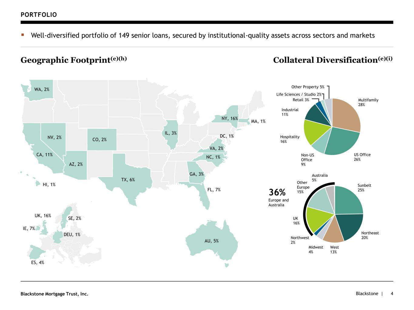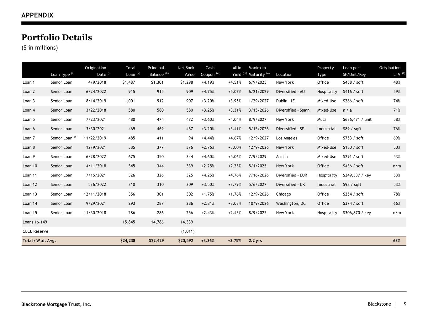 Blackstone |Blackstone Mortgage Trust, Inc. APPENDIX 9 Portfolio Details ($ in millions) Loan Type (k) Origination Date (l) Total Loan (k) Principal Balance (k) Net Book Value Cash Coupon (m) All-in Yield (m) Maximum Maturity (n) Location Property Type Loan per SF/Unit/Key Origination LTV (f) Loan 1 Senior Loan 4/9/2018 $1,487 $1,301 $1,298 +4.19% +4.51% 6/9/2025 New York Office $458 / sqft 48% Loan 2 Senior Loan 6/24/2022 915 915 909 +4.75% +5.07% 6/21/2029 Diversified - AU Hospitality $416 / sqft 59% Loan 3 Senior Loan 8/14/2019 1,001 912 907 +3.20% +3.95% 1/29/2027 Dublin - IE Mixed-Use $266 / sqft 74% Loan 4 Senior Loan 3/22/2018 580 580 580 +3.25% +3.31% 3/15/2026 Diversified - Spain Mixed-Use n / a 71% Loan 5 Senior Loan 7/23/2021 480 474 472 +3.60% +4.04% 8/9/2027 New York Multi $636,471 / unit 58% Loan 6 Senior Loan 3/30/2021 469 469 467 +3.20% +3.41% 5/15/2026 Diversified - SE Industrial $89 / sqft 76% Loan 7 Senior Loan (k) 11/22/2019 485 411 94 +4.44% +4.67% 12/9/2027 Los Angeles Office $753 / sqft 69% Loan 8 Senior Loan 12/9/2021 385 377 376 +2.76% +3.00% 12/9/2026 New York Mixed-Use $130 / sqft 50% Loan 9 Senior Loan 6/28/2022 675 350 344 +4.60% +5.06% 7/9/2029 Austin Mixed-Use $291 / sqft 53% Loan 10 Senior Loan 4/11/2018 345 344 339 +2.25% +2.25% 5/1/2025 New York Office $436 / sqft n/m Loan 11 Senior Loan 7/15/2021 326 326 325 +4.25% +4.76% 7/16/2026 Diversified - EUR Hospitality $249,337 / key 53% Loan 12 Senior Loan 5/6/2022 310 310 309 +3.50% +3.79% 5/6/2027 Diversified - UK Industrial $98 / sqft 53% Loan 13 Senior Loan 12/11/2018 356 301 302 +1.75% +1.76% 12/9/2026 Chicago Office $254 / sqft 78% Loan 14 Senior Loan 9/29/2021 293 287 286 +2.81% +3.03% 10/9/2026 Washington, DC Office $374 / sqft 66% Loan 15 Senior Loan 11/30/2018 286 286 256 +2.43% +2.43% 8/9/2025 New York Hospitality $306,870 / key n/m Loans 16–14 15,845 14,786 14,339 CECL Reserve (1,011) $24,238 $22,429 $20,592 +3.36% +3.75% 2.2 yrs 63%Total / Wtd. Avg.