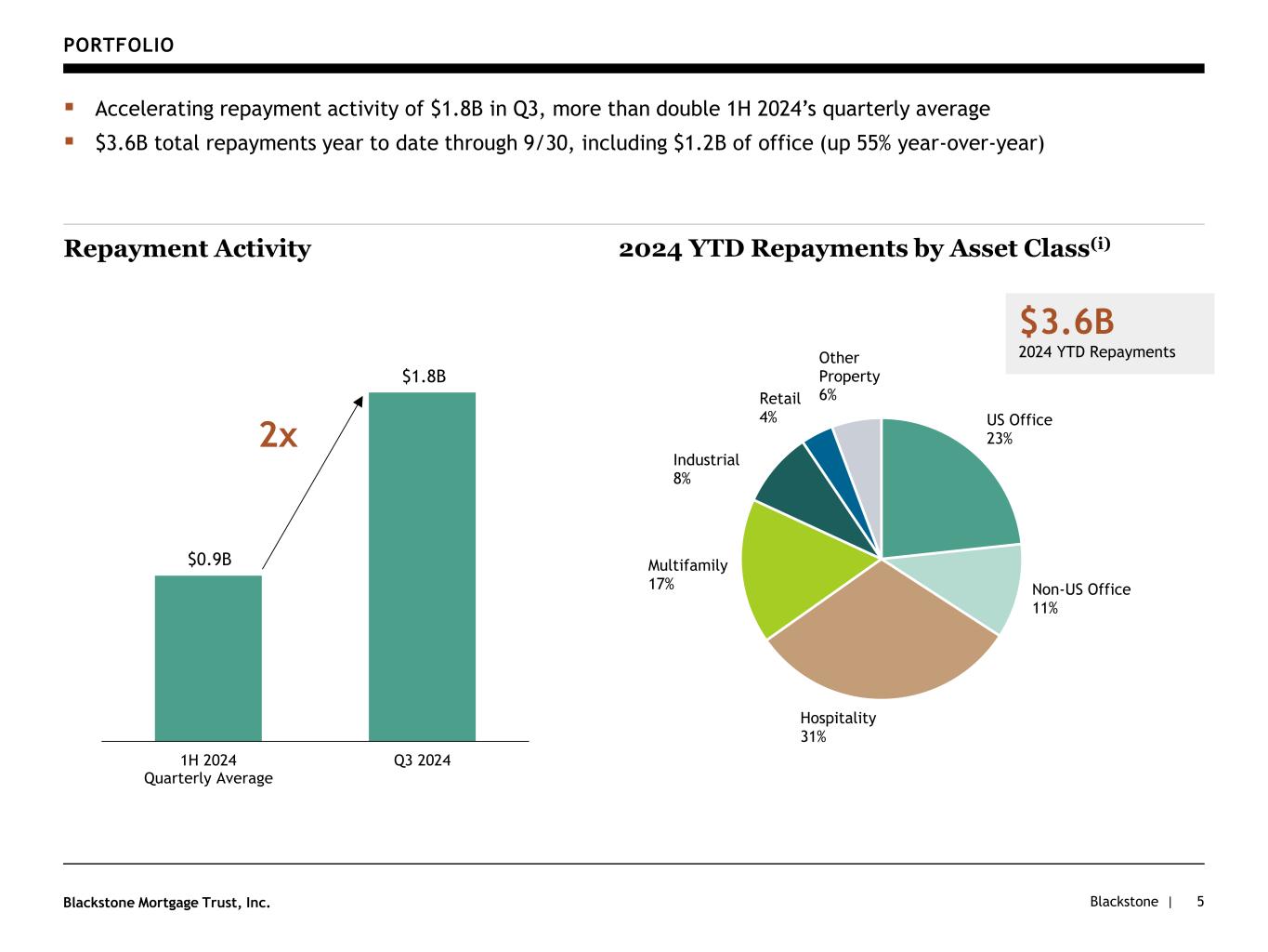Blackstone |Blackstone Mortgage Trust, Inc. PORTFOLIO 4 ▪ Well-diversified portfolio of 149 senior loans, secured by institutional-quality assets across sectors and markets Collateral Diversification(e)(i) AU, 5% ES, 4% IE, 7% UK, 16% SE, 2% DEU, 1% Geographic Footprint(e)(h) DC, 1% TX, 6% NY, 16% NV, 2% MA, 1% IL, 3% GA, 3% FL, 7% CA, 11% VA, 2% AZ, 2% CO, 2% NC, 1% WA, 2% Sunbelt 25% Northeast 20% West 13% Midwest 4% Northwest 2% UK 16% Other Europe 15% Australia 5% Multifamily 28% US Office 26% Non-US Office 9% Hospitality 16% Industrial 11% Retail 3% Life Sciences / Studio 2% Other Property 5% HI, 1% 36% Europe and Australia