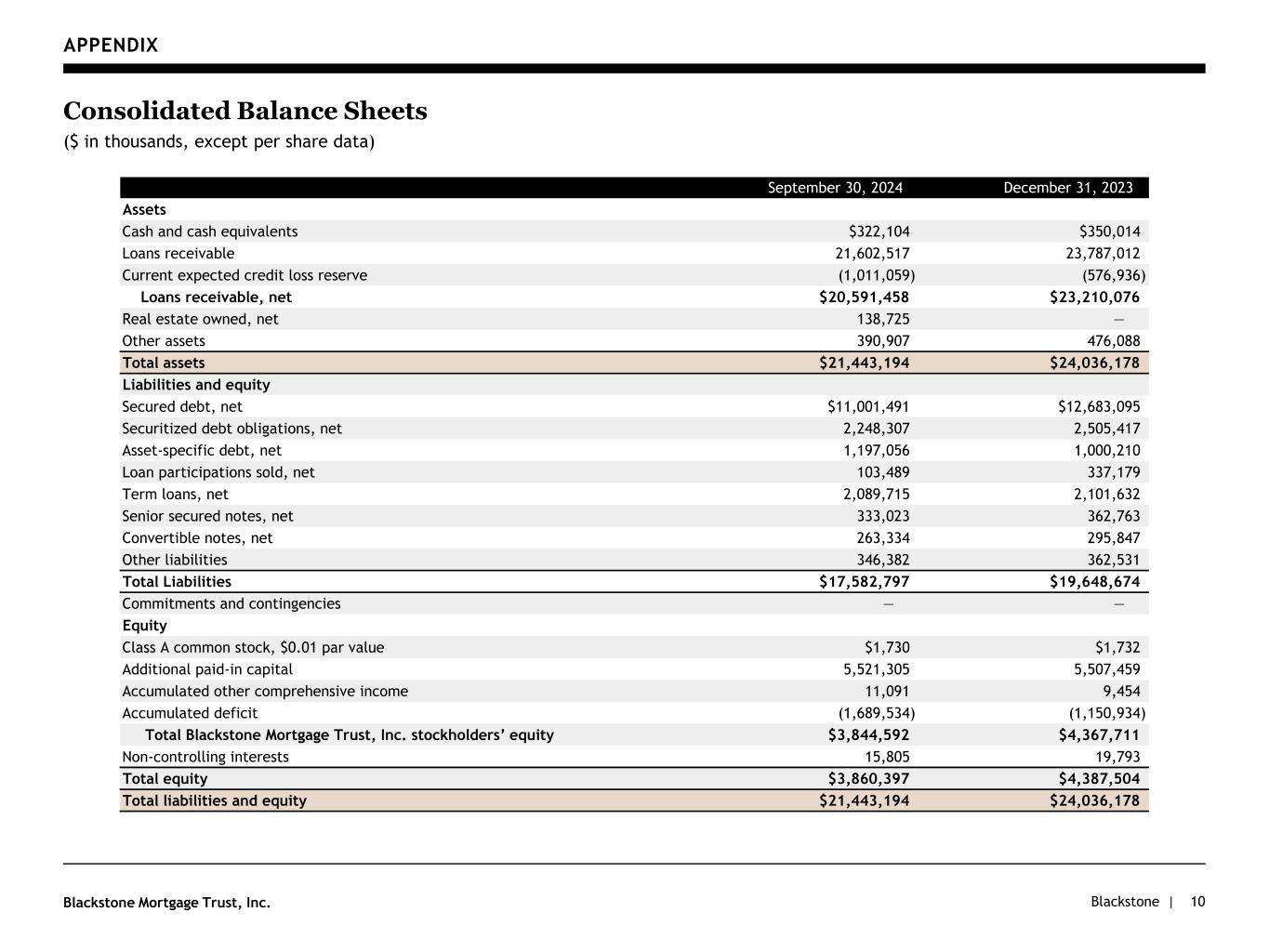 Blackstone |Blackstone Mortgage Trust, Inc. APPENDIX 10 Consolidated Balance Sheets ($ in thousands, except per share data) September 30, 2024 December 31, 2023 Assets Cash and cash equivalents $322,104 $350,014 Loans receivable 21,602,517 23,787,012 Current expected credit loss reserve (1,011,059) (576,936) Loans receivable, net $20,591,458 $23,210,076 Real estate owned, net 138,725 — Other assets 390,907 476,088 Total assets $21,443,194 $24,036,178 Liabilities and equity Secured debt, net $11,001,491 $12,683,095 Securitized debt obligations, net 2,248,307 2,505,417 Asset-specific debt, net 1,197,056 1,000,210 Loan participations sold, net 103,489 337,179 Term loans, net 2,089,715 2,101,632 Senior secured notes, net 333,023 362,763 Convertible notes, net 263,334 295,847 Other liabilities 346,382 362,531 Total Liabilities $17,582,797 $19,648,674 Commitments and contingencies — — Equity Class A common stock, $0.01 par value $1,730 $1,732 Additional paid-in capital 5,521,305 5,507,459 Accumulated other comprehensive income 11,091 9,454 Accumulated deficit (1,689,534) (1,150,934) Total Blackstone Mortgage Trust, Inc. stockholders’ equity $3,844,592 $4,367,711 Non-controlling interests 15,805 19,793 Total equity $3,860,397 $4,387,504 Total liabilities and equity $21,443,194 $24,036,178