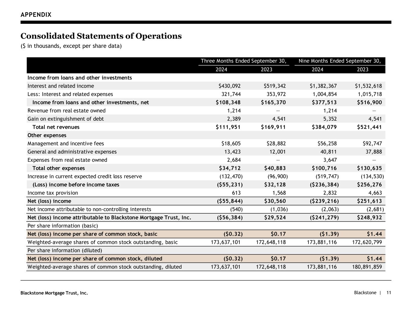 Blackstone |Blackstone Mortgage Trust, Inc. APPENDIX 11 Consolidated Statements of Operations ($ in thousands, except per share data) nice 2024 2023 2024 2023 Income from loans and other investments Interest and related income $430,092 $519,342 $1,382,367 $1,532,618 Less: Interest and related expenses 321,744 353,972 1,004,854 1,015,718 Income from loans and other investments, net $108,348 $165,370 $377,513 $516,900 Revenue from real estate owned 1,214 — 1,214 — Gain on extinguishment of debt 2,389 4,541 5,352 4,541 Total net revenues $111,951 $169,911 $384,079 $521,441 Other expenses Management and incentive fees $18,605 $28,882 $56,258 $92,747 General and administrative expenses 13,423 12,001 40,811 37,888 Expenses from real estate owned 2,684 — 3,647 — Total other expenses $34,712 $40,883 $100,716 $130,635 Increase in current expected credit loss reserve (132,470) (96,900) (519,747) (134,530) (Loss) income before income taxes ($55,231) $32,128 ($236,384) $256,276 Income tax provision 613 1,568 2,832 4,663 Net (loss) income ($55,844) $30,560 ($239,216) $251,613 Net income attributable to non-controlling interests (540) (1,036) (2,063) (2,681) Net (loss) income attributable to Blackstone Mortgage Trust, Inc. ($56,384) $29,524 ($241,279) $248,932 Per share information (basic) Net (loss) income per share of common stock, basic ($0.32) $0.17 ($1.39) $1.44 Weighted-average shares of common stock outstanding, basic 173,637,101 172,648,118 173,881,116 172,620,799 Per share information (diluted) Net (loss) income per share of common stock, diluted ($0.32) $0.17 ($1.39) $1.44 Weighted-average shares of common stock outstanding, diluted 173,637,101 172,648,118 173,881,116 180,891,859 Three Months Ended September 30, Nine Months Ended September 30,