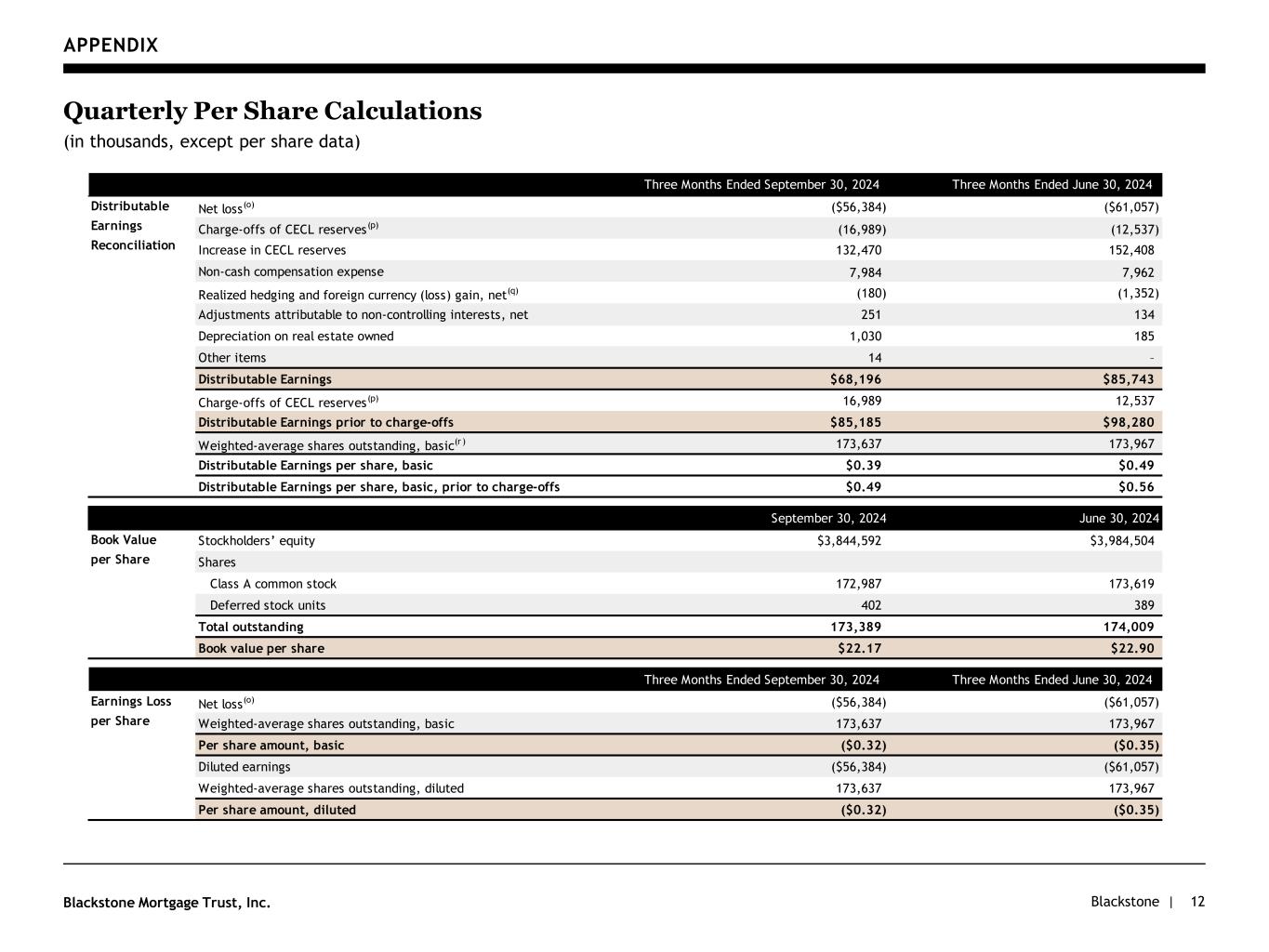 Blackstone |Blackstone Mortgage Trust, Inc. APPENDIX 12 Quarterly Per Share Calculations (in thousands, except per share data) Three Months Ended September 30, 2024 Three Months Ended June 30, 2024 Net loss(o) ($56,384) ($61,057) Charge-offs of CECL reserves (p) (16,989) (12,537) Increase in CECL reserves 132,470 152,408 Non-cash compensation expense 7,984 7,962 Realized hedging and foreign currency (loss) gain, net(q) (180) (1,352) Adjustments attributable to non-controlling interests, net 251 134 Depreciation on real estate owned 1,030 185 Other items 14 – Distributable Earnings $68,196 $85,743 Charge-offs of CECL reserves (p) 16,989 12,537 Distributable Earnings prior to charge-offs $85,185 $98,280 Weighted-average shares outstanding, basic(r ) 173,637 173,967 Distributable Earnings per share, basic $0.39 $0.49 Distributable Earnings per share, basic, prior to charge-offs $0.49 $0.56 September 30, 2024 June 30, 2024 tockholders’ equity $3,844,592 $3,984,504 Shares Class A common stock 172,987 173,619 Deferred stock units 402 389 Total outstanding 173,389 174,009 Book value per share $22.17 $22.90 Three Months Ended September 30, 2024 Three Months Ended June 30, 2024 Net loss(o) ($56,384) ($61,057) Weighted-average shares outstanding, basic 173,637 173,967 Per share amount, basic ($0.32) ($0.35) Diluted earnings ($56,384) ($61,057) Weighted-average shares outstanding, diluted 173,637 173,967 Per share amount, diluted ($0.32) ($0.35) Distributable Earnings Reconciliation Book Value per Share Earnings Loss per Share
