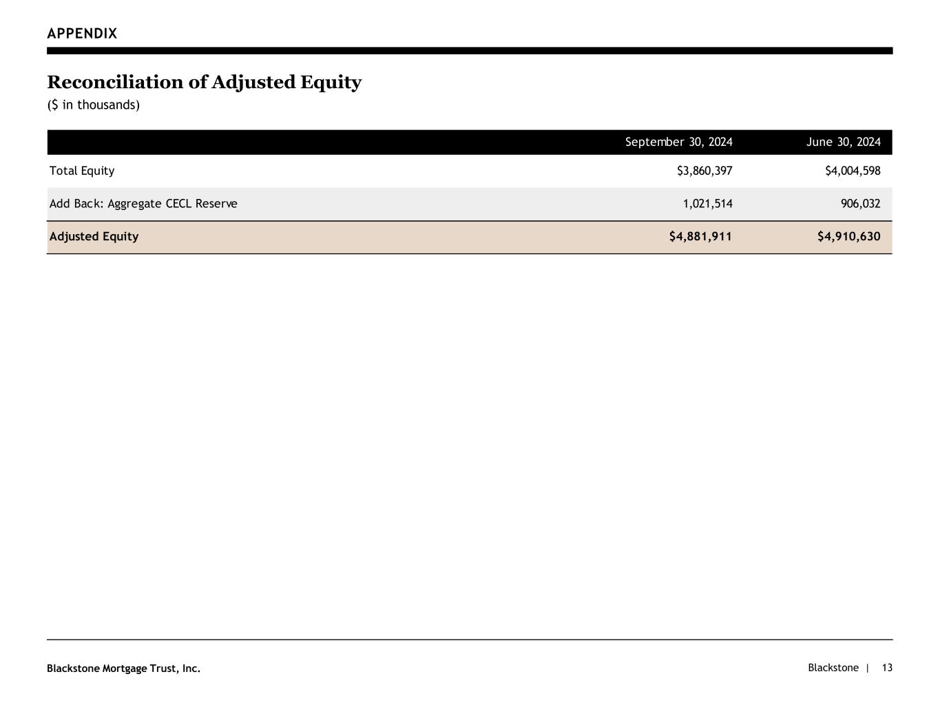 Blackstone |Blackstone Mortgage Trust, Inc. APPENDIX 13 Reconciliation of Adjusted Equity ($ in thousands) September 30, 2024 June 30, 2024 Total Equity $3,860,397 $4,004,598 Add Back: Aggregate CECL Reserve 1,021,514 906,032 Adjusted Equity $4,881,911 $4,910,630