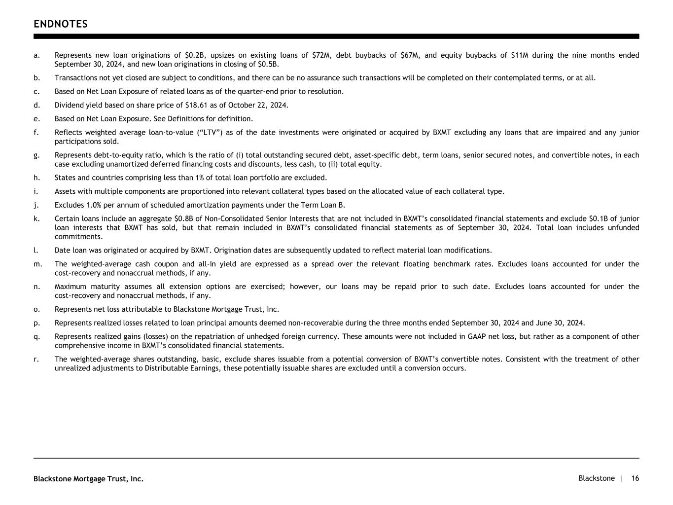Blackstone |Blackstone Mortgage Trust, Inc. DEFINITIONS 15 Non-Consolidated Senior Interests: Senior interests in loans originated and syndicated to third parties. These non-recourse loan participations, which are excluded from the GAAP balance sheet, constitute additional financing capacity and are included in discussions of the loan portfolio. Net Loan Exposure: Represents loans that are included in BXMT’s consolidated financial statements, net of (i) asset-specific debt, (ii) participations sold, (iii) cost-recovery proceeds, and (iv) CECL reserves on its loans receivable.