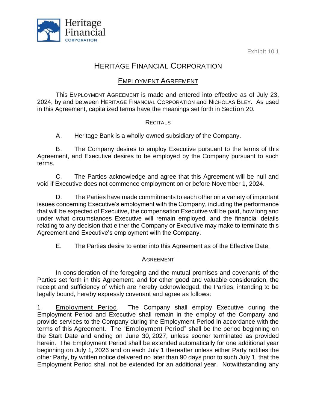 Exhibit 10.1 HERITAGE FINANCIAL CORPORATION EMPLOYMENT AGREEMENT This EMPLOYMENT AGREEMENT is made and entered into effective as of July 23, 2024, by and between HERITAGE FINANCIAL CORPORATION and NICHOLAS BLEY. As used in this Agreement, capitalized terms have the meanings set forth in Section 20. RECITALS A. Heritage Bank is a wholly-owned subsidiary of the Company. B. The Company desires to employ Executive pursuant to the terms of this Agreement, and Executive desires to be employed by the Company pursuant to such terms. C. The Parties acknowledge and agree that this Agreement will be null and void if Executive does not commence employment on or before November 1, 2024. D. The Parties have made commitments to each other on a variety of important issues concerning Executive’s employment with the Company, including the performance that will be expected of Executive, the compensation Executive will be paid, how long and under what circumstances Executive will remain employed, and the financial details relating to any decision that either the Company or Executive may make to terminate this Agreement and Executive’s employment with the Company. E. The Parties desire to enter into this Agreement as of the Effective Date. AGREEMENT In consideration of the foregoing and the mutual promises and covenants of the Parties set forth in this Agreement, and for other good and valuable consideration, the receipt and sufficiency of which are hereby acknowledged, the Parties, intending to be legally bound, hereby expressly covenant and agree as follows: 1. Employment Period. The Company shall employ Executive during the Employment Period and Executive shall remain in the employ of the Company and provide services to the Company during the Employment Period in accordance with the terms of this Agreement. The “Employment Period” shall be the period beginning on the Start Date and ending on June 30, 2027, unless sooner terminated as provided herein. The Employment Period shall be extended automatically for one additional year beginning on July 1, 2026 and on each July 1 thereafter unless either Party notifies the other Party, by written notice delivered no later than 90 days prior to such July 1, that the Employment Period shall not be extended for an additional year. Notwithstanding any