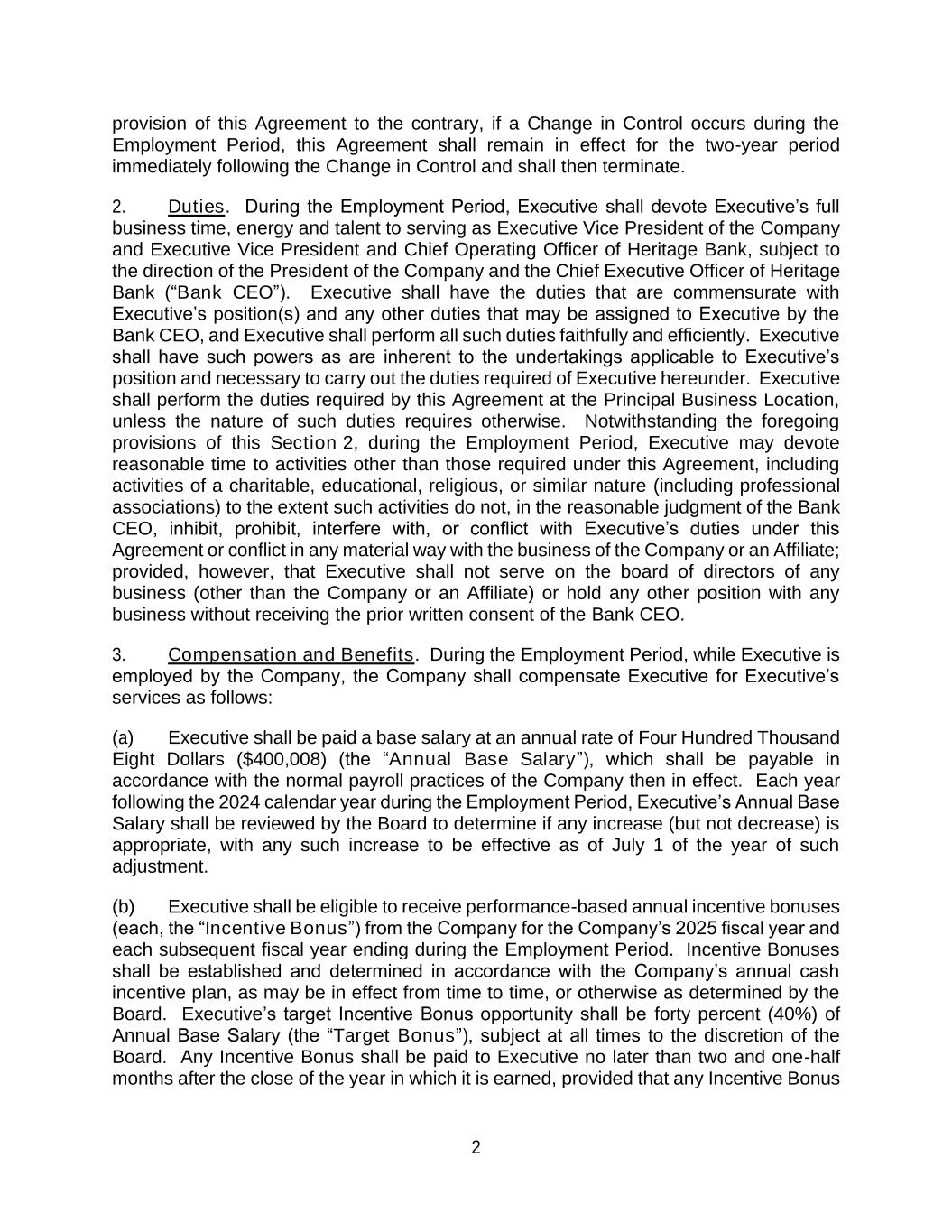 2 provision of this Agreement to the contrary, if a Change in Control occurs during the Employment Period, this Agreement shall remain in effect for the two-year period immediately following the Change in Control and shall then terminate. 2. Duties. During the Employment Period, Executive shall devote Executive’s full business time, energy and talent to serving as Executive Vice President of the Company and Executive Vice President and Chief Operating Officer of Heritage Bank, subject to the direction of the President of the Company and the Chief Executive Officer of Heritage Bank (“Bank CEO”). Executive shall have the duties that are commensurate with Executive’s position(s) and any other duties that may be assigned to Executive by the Bank CEO, and Executive shall perform all such duties faithfully and efficiently. Executive shall have such powers as are inherent to the undertakings applicable to Executive’s position and necessary to carry out the duties required of Executive hereunder. Executive shall perform the duties required by this Agreement at the Principal Business Location, unless the nature of such duties requires otherwise. Notwithstanding the foregoing provisions of this Section 2, during the Employment Period, Executive may devote reasonable time to activities other than those required under this Agreement, including activities of a charitable, educational, religious, or similar nature (including professional associations) to the extent such activities do not, in the reasonable judgment of the Bank CEO, inhibit, prohibit, interfere with, or conflict with Executive’s duties under this Agreement or conflict in any material way with the business of the Company or an Affiliate; provided, however, that Executive shall not serve on the board of directors of any business (other than the Company or an Affiliate) or hold any other position with any business without receiving the prior written consent of the Bank CEO. 3. Compensation and Benefits. During the Employment Period, while Executive is employed by the Company, the Company shall compensate Executive for Executive’s services as follows: (a) Executive shall be paid a base salary at an annual rate of Four Hundred Thousand Eight Dollars ($400,008) (the “Annual Base Salary”), which shall be payable in accordance with the normal payroll practices of the Company then in effect. Each year following the 2024 calendar year during the Employment Period, Executive’s Annual Base Salary shall be reviewed by the Board to determine if any increase (but not decrease) is appropriate, with any such increase to be effective as of July 1 of the year of such adjustment. (b) Executive shall be eligible to receive performance-based annual incentive bonuses (each, the “Incentive Bonus”) from the Company for the Company’s 2025 fiscal year and each subsequent fiscal year ending during the Employment Period. Incentive Bonuses shall be established and determined in accordance with the Company’s annual cash incentive plan, as may be in effect from time to time, or otherwise as determined by the Board. Executive’s target Incentive Bonus opportunity shall be forty percent (40%) of Annual Base Salary (the “Target Bonus”), subject at all times to the discretion of the Board. Any Incentive Bonus shall be paid to Executive no later than two and one-half months after the close of the year in which it is earned, provided that any Incentive Bonus