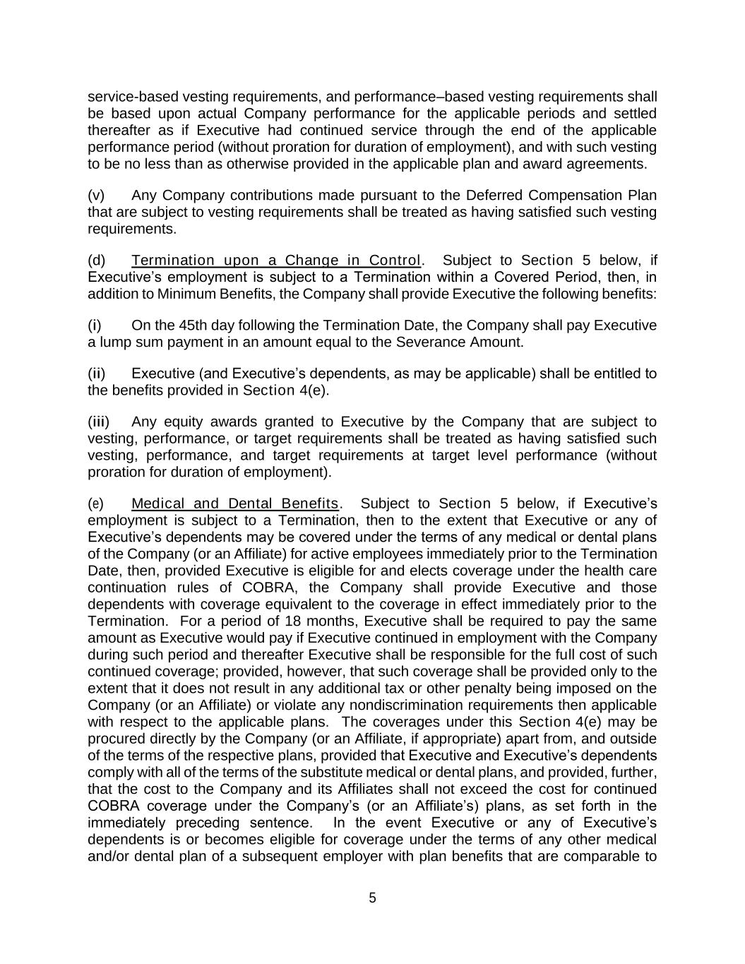 5 service-based vesting requirements, and performance–based vesting requirements shall be based upon actual Company performance for the applicable periods and settled thereafter as if Executive had continued service through the end of the applicable performance period (without proration for duration of employment), and with such vesting to be no less than as otherwise provided in the applicable plan and award agreements. (v) Any Company contributions made pursuant to the Deferred Compensation Plan that are subject to vesting requirements shall be treated as having satisfied such vesting requirements. (d) Termination upon a Change in Control. Subject to Section 5 below, if Executive’s employment is subject to a Termination within a Covered Period, then, in addition to Minimum Benefits, the Company shall provide Executive the following benefits: (i) On the 45th day following the Termination Date, the Company shall pay Executive a lump sum payment in an amount equal to the Severance Amount. (ii) Executive (and Executive’s dependents, as may be applicable) shall be entitled to the benefits provided in Section 4(e). (iii) Any equity awards granted to Executive by the Company that are subject to vesting, performance, or target requirements shall be treated as having satisfied such vesting, performance, and target requirements at target level performance (without proration for duration of employment). (e) Medical and Dental Benefits. Subject to Section 5 below, if Executive’s employment is subject to a Termination, then to the extent that Executive or any of Executive’s dependents may be covered under the terms of any medical or dental plans of the Company (or an Affiliate) for active employees immediately prior to the Termination Date, then, provided Executive is eligible for and elects coverage under the health care continuation rules of COBRA, the Company shall provide Executive and those dependents with coverage equivalent to the coverage in effect immediately prior to the Termination. For a period of 18 months, Executive shall be required to pay the same amount as Executive would pay if Executive continued in employment with the Company during such period and thereafter Executive shall be responsible for the full cost of such continued coverage; provided, however, that such coverage shall be provided only to the extent that it does not result in any additional tax or other penalty being imposed on the Company (or an Affiliate) or violate any nondiscrimination requirements then applicable with respect to the applicable plans. The coverages under this Section 4(e) may be procured directly by the Company (or an Affiliate, if appropriate) apart from, and outside of the terms of the respective plans, provided that Executive and Executive’s dependents comply with all of the terms of the substitute medical or dental plans, and provided, further, that the cost to the Company and its Affiliates shall not exceed the cost for continued COBRA coverage under the Company’s (or an Affiliate’s) plans, as set forth in the immediately preceding sentence. In the event Executive or any of Executive’s dependents is or becomes eligible for coverage under the terms of any other medical and/or dental plan of a subsequent employer with plan benefits that are comparable to