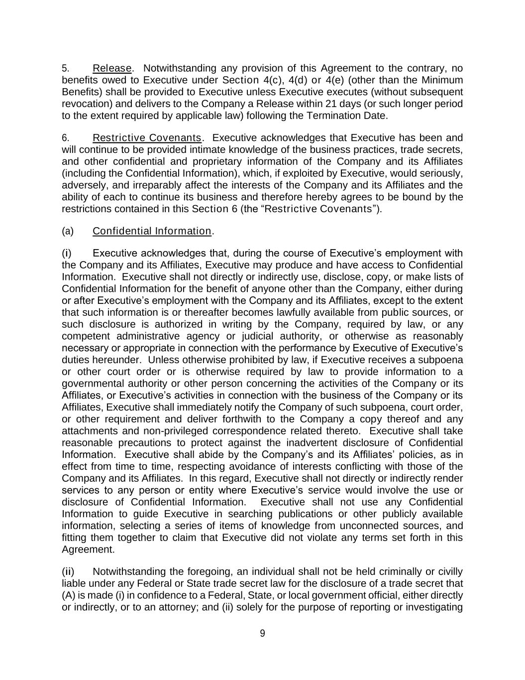 9 5. Release. Notwithstanding any provision of this Agreement to the contrary, no benefits owed to Executive under Section 4(c), 4(d) or 4(e) (other than the Minimum Benefits) shall be provided to Executive unless Executive executes (without subsequent revocation) and delivers to the Company a Release within 21 days (or such longer period to the extent required by applicable law) following the Termination Date. 6. Restrictive Covenants. Executive acknowledges that Executive has been and will continue to be provided intimate knowledge of the business practices, trade secrets, and other confidential and proprietary information of the Company and its Affiliates (including the Confidential Information), which, if exploited by Executive, would seriously, adversely, and irreparably affect the interests of the Company and its Affiliates and the ability of each to continue its business and therefore hereby agrees to be bound by the restrictions contained in this Section 6 (the “Restrictive Covenants”). (a) Confidential Information. (i) Executive acknowledges that, during the course of Executive’s employment with the Company and its Affiliates, Executive may produce and have access to Confidential Information. Executive shall not directly or indirectly use, disclose, copy, or make lists of Confidential Information for the benefit of anyone other than the Company, either during or after Executive’s employment with the Company and its Affiliates, except to the extent that such information is or thereafter becomes lawfully available from public sources, or such disclosure is authorized in writing by the Company, required by law, or any competent administrative agency or judicial authority, or otherwise as reasonably necessary or appropriate in connection with the performance by Executive of Executive’s duties hereunder. Unless otherwise prohibited by law, if Executive receives a subpoena or other court order or is otherwise required by law to provide information to a governmental authority or other person concerning the activities of the Company or its Affiliates, or Executive’s activities in connection with the business of the Company or its Affiliates, Executive shall immediately notify the Company of such subpoena, court order, or other requirement and deliver forthwith to the Company a copy thereof and any attachments and non-privileged correspondence related thereto. Executive shall take reasonable precautions to protect against the inadvertent disclosure of Confidential Information. Executive shall abide by the Company’s and its Affiliates’ policies, as in effect from time to time, respecting avoidance of interests conflicting with those of the Company and its Affiliates. In this regard, Executive shall not directly or indirectly render services to any person or entity where Executive’s service would involve the use or disclosure of Confidential Information. Executive shall not use any Confidential Information to guide Executive in searching publications or other publicly available information, selecting a series of items of knowledge from unconnected sources, and fitting them together to claim that Executive did not violate any terms set forth in this Agreement. (ii) Notwithstanding the foregoing, an individual shall not be held criminally or civilly liable under any Federal or State trade secret law for the disclosure of a trade secret that (A) is made (i) in confidence to a Federal, State, or local government official, either directly or indirectly, or to an attorney; and (ii) solely for the purpose of reporting or investigating