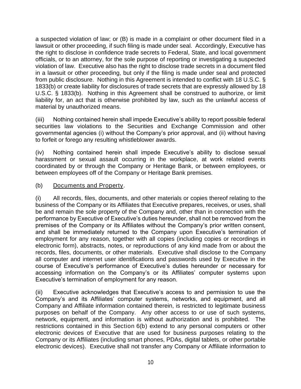 10 a suspected violation of law; or (B) is made in a complaint or other document filed in a lawsuit or other proceeding, if such filing is made under seal. Accordingly, Executive has the right to disclose in confidence trade secrets to Federal, State, and local government officials, or to an attorney, for the sole purpose of reporting or investigating a suspected violation of law. Executive also has the right to disclose trade secrets in a document filed in a lawsuit or other proceeding, but only if the filing is made under seal and protected from public disclosure. Nothing in this Agreement is intended to conflict with 18 U.S.C. § 1833(b) or create liability for disclosures of trade secrets that are expressly allowed by 18 U.S.C. § 1833(b). Nothing in this Agreement shall be construed to authorize, or limit liability for, an act that is otherwise prohibited by law, such as the unlawful access of material by unauthorized means. (iii) Nothing contained herein shall impede Executive’s ability to report possible federal securities law violations to the Securities and Exchange Commission and other governmental agencies (i) without the Company’s prior approval, and (ii) without having to forfeit or forego any resulting whistleblower awards. (iv) Nothing contained herein shall impede Executive’s ability to disclose sexual harassment or sexual assault occurring in the workplace, at work related events coordinated by or through the Company or Heritage Bank, or between employees, or between employees off of the Company or Heritage Bank premises. (b) Documents and Property. (i) All records, files, documents, and other materials or copies thereof relating to the business of the Company or its Affiliates that Executive prepares, receives, or uses, shall be and remain the sole property of the Company and, other than in connection with the performance by Executive of Executive’s duties hereunder, shall not be removed from the premises of the Company or its Affiliates without the Company’s prior written consent, and shall be immediately returned to the Company upon Executive’s termination of employment for any reason, together with all copies (including copies or recordings in electronic form), abstracts, notes, or reproductions of any kind made from or about the records, files, documents, or other materials. Executive shall disclose to the Company all computer and internet user identifications and passwords used by Executive in the course of Executive’s performance of Executive’s duties hereunder or necessary for accessing information on the Company’s or its Affiliates’ computer systems upon Executive’s termination of employment for any reason. (ii) Executive acknowledges that Executive’s access to and permission to use the Company’s and its Affiliates’ computer systems, networks, and equipment, and all Company and Affiliate information contained therein, is restricted to legitimate business purposes on behalf of the Company. Any other access to or use of such systems, network, equipment, and information is without authorization and is prohibited. The restrictions contained in this Section 6(b) extend to any personal computers or other electronic devices of Executive that are used for business purposes relating to the Company or its Affiliates (including smart phones, PDAs, digital tablets, or other portable electronic devices). Executive shall not transfer any Company or Affiliate information to