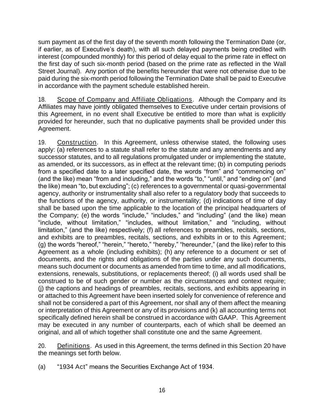16 sum payment as of the first day of the seventh month following the Termination Date (or, if earlier, as of Executive’s death), with all such delayed payments being credited with interest (compounded monthly) for this period of delay equal to the prime rate in effect on the first day of such six-month period (based on the prime rate as reflected in the Wall Street Journal). Any portion of the benefits hereunder that were not otherwise due to be paid during the six-month period following the Termination Date shall be paid to Executive in accordance with the payment schedule established herein. 18. Scope of Company and Affiliate Obligations. Although the Company and its Affiliates may have jointly obligated themselves to Executive under certain provisions of this Agreement, in no event shall Executive be entitled to more than what is explicitly provided for hereunder, such that no duplicative payments shall be provided under this Agreement. 19. Construction. In this Agreement, unless otherwise stated, the following uses apply: (a) references to a statute shall refer to the statute and any amendments and any successor statutes, and to all regulations promulgated under or implementing the statute, as amended, or its successors, as in effect at the relevant time; (b) in computing periods from a specified date to a later specified date, the words “from” and “commencing on” (and the like) mean “from and including,” and the words “to,” “until,” and “ending on” (and the like) mean “to, but excluding”; (c) references to a governmental or quasi-governmental agency, authority or instrumentality shall also refer to a regulatory body that succeeds to the functions of the agency, authority, or instrumentality; (d) indications of time of day shall be based upon the time applicable to the location of the principal headquarters of the Company; (e) the words “include,” “includes,” and “including” (and the like) mean “include, without limitation,” “includes, without limitation,” and “including, without limitation,” (and the like) respectively; (f) all references to preambles, recitals, sections, and exhibits are to preambles, recitals, sections, and exhibits in or to this Agreement; (g) the words “hereof,” “herein,” “hereto,” “hereby,” “hereunder,” (and the like) refer to this Agreement as a whole (including exhibits); (h) any reference to a document or set of documents, and the rights and obligations of the parties under any such documents, means such document or documents as amended from time to time, and all modifications, extensions, renewals, substitutions, or replacements thereof; (i) all words used shall be construed to be of such gender or number as the circumstances and context require; (j) the captions and headings of preambles, recitals, sections, and exhibits appearing in or attached to this Agreement have been inserted solely for convenience of reference and shall not be considered a part of this Agreement, nor shall any of them affect the meaning or interpretation of this Agreement or any of its provisions and (k) all accounting terms not specifically defined herein shall be construed in accordance with GAAP. This Agreement may be executed in any number of counterparts, each of which shall be deemed an original, and all of which together shall constitute one and the same Agreement. 20. Definitions. As used in this Agreement, the terms defined in this Section 20 have the meanings set forth below. (a) “1934 Act” means the Securities Exchange Act of 1934.