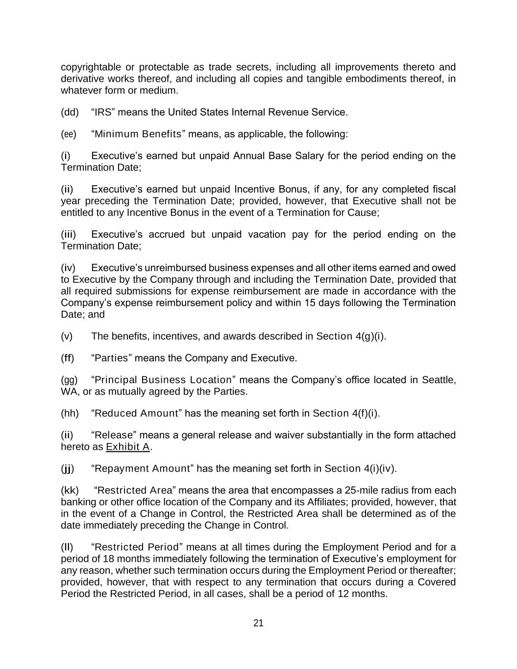 21 copyrightable or protectable as trade secrets, including all improvements thereto and derivative works thereof, and including all copies and tangible embodiments thereof, in whatever form or medium. (dd) “IRS” means the United States Internal Revenue Service. (ee) “Minimum Benefits” means, as applicable, the following: (i) Executive’s earned but unpaid Annual Base Salary for the period ending on the Termination Date; (ii) Executive’s earned but unpaid Incentive Bonus, if any, for any completed fiscal year preceding the Termination Date; provided, however, that Executive shall not be entitled to any Incentive Bonus in the event of a Termination for Cause; (iii) Executive’s accrued but unpaid vacation pay for the period ending on the Termination Date; (iv) Executive’s unreimbursed business expenses and all other items earned and owed to Executive by the Company through and including the Termination Date, provided that all required submissions for expense reimbursement are made in accordance with the Company’s expense reimbursement policy and within 15 days following the Termination Date; and (v) The benefits, incentives, and awards described in Section 4(g)(i). (ff) “Parties” means the Company and Executive. (gg) “Principal Business Location” means the Company’s office located in Seattle, WA, or as mutually agreed by the Parties. (hh) “Reduced Amount” has the meaning set forth in Section 4(f)(i). (ii) “Release” means a general release and waiver substantially in the form attached hereto as Exhibit A. (jj) “Repayment Amount” has the meaning set forth in Section 4(i)(iv). (kk) “Restricted Area” means the area that encompasses a 25-mile radius from each banking or other office location of the Company and its Affiliates; provided, however, that in the event of a Change in Control, the Restricted Area shall be determined as of the date immediately preceding the Change in Control. (ll) “Restricted Period” means at all times during the Employment Period and for a period of 18 months immediately following the termination of Executive’s employment for any reason, whether such termination occurs during the Employment Period or thereafter; provided, however, that with respect to any termination that occurs during a Covered Period the Restricted Period, in all cases, shall be a period of 12 months.