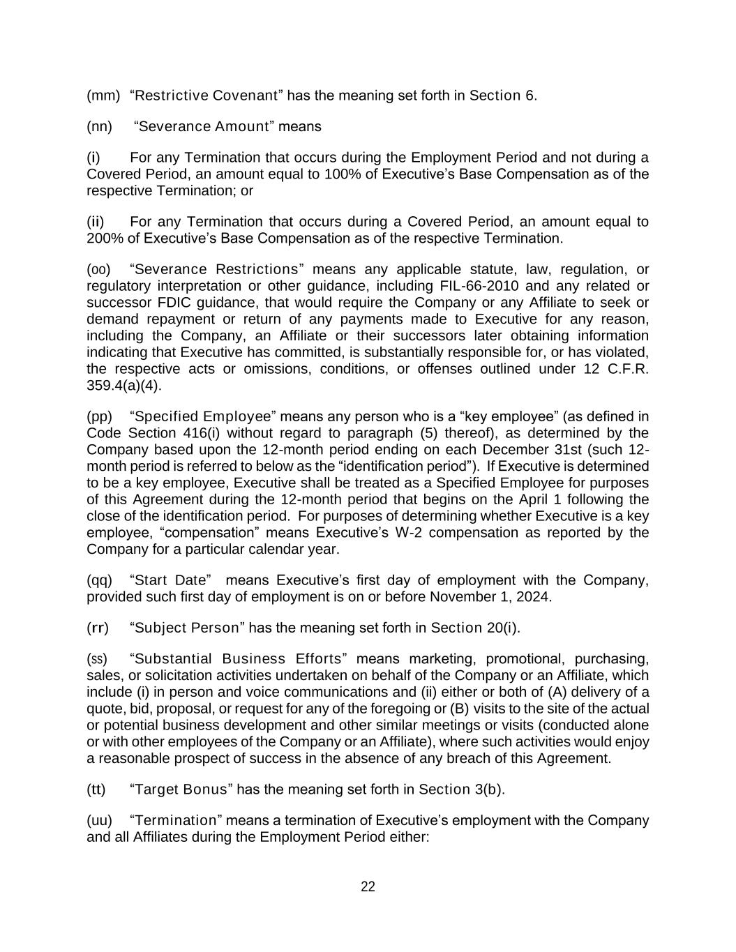 22 (mm) “Restrictive Covenant” has the meaning set forth in Section 6. (nn) “Severance Amount” means (i) For any Termination that occurs during the Employment Period and not during a Covered Period, an amount equal to 100% of Executive’s Base Compensation as of the respective Termination; or (ii) For any Termination that occurs during a Covered Period, an amount equal to 200% of Executive’s Base Compensation as of the respective Termination. (oo) “Severance Restrictions” means any applicable statute, law, regulation, or regulatory interpretation or other guidance, including FIL-66-2010 and any related or successor FDIC guidance, that would require the Company or any Affiliate to seek or demand repayment or return of any payments made to Executive for any reason, including the Company, an Affiliate or their successors later obtaining information indicating that Executive has committed, is substantially responsible for, or has violated, the respective acts or omissions, conditions, or offenses outlined under 12 C.F.R. 359.4(a)(4). (pp) “Specified Employee” means any person who is a “key employee” (as defined in Code Section 416(i) without regard to paragraph (5) thereof), as determined by the Company based upon the 12-month period ending on each December 31st (such 12- month period is referred to below as the “identification period”). If Executive is determined to be a key employee, Executive shall be treated as a Specified Employee for purposes of this Agreement during the 12-month period that begins on the April 1 following the close of the identification period. For purposes of determining whether Executive is a key employee, “compensation” means Executive’s W-2 compensation as reported by the Company for a particular calendar year. (qq) “Start Date” means Executive’s first day of employment with the Company, provided such first day of employment is on or before November 1, 2024. (rr) “Subject Person” has the meaning set forth in Section 20(i). (ss) “Substantial Business Efforts” means marketing, promotional, purchasing, sales, or solicitation activities undertaken on behalf of the Company or an Affiliate, which include (i) in person and voice communications and (ii) either or both of (A) delivery of a quote, bid, proposal, or request for any of the foregoing or (B) visits to the site of the actual or potential business development and other similar meetings or visits (conducted alone or with other employees of the Company or an Affiliate), where such activities would enjoy a reasonable prospect of success in the absence of any breach of this Agreement. (tt) “Target Bonus” has the meaning set forth in Section 3(b). (uu) “Termination” means a termination of Executive’s employment with the Company and all Affiliates during the Employment Period either: