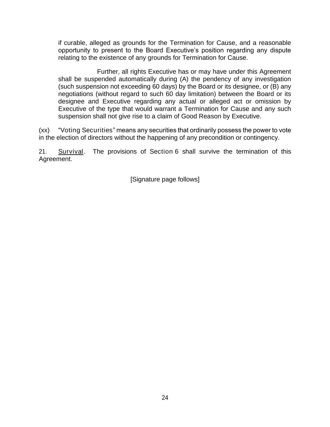24 if curable, alleged as grounds for the Termination for Cause, and a reasonable opportunity to present to the Board Executive’s position regarding any dispute relating to the existence of any grounds for Termination for Cause. Further, all rights Executive has or may have under this Agreement shall be suspended automatically during (A) the pendency of any investigation (such suspension not exceeding 60 days) by the Board or its designee, or (B) any negotiations (without regard to such 60 day limitation) between the Board or its designee and Executive regarding any actual or alleged act or omission by Executive of the type that would warrant a Termination for Cause and any such suspension shall not give rise to a claim of Good Reason by Executive. (xx) “Voting Securities” means any securities that ordinarily possess the power to vote in the election of directors without the happening of any precondition or contingency. 21. Survival. The provisions of Section 6 shall survive the termination of this Agreement. [Signature page follows]