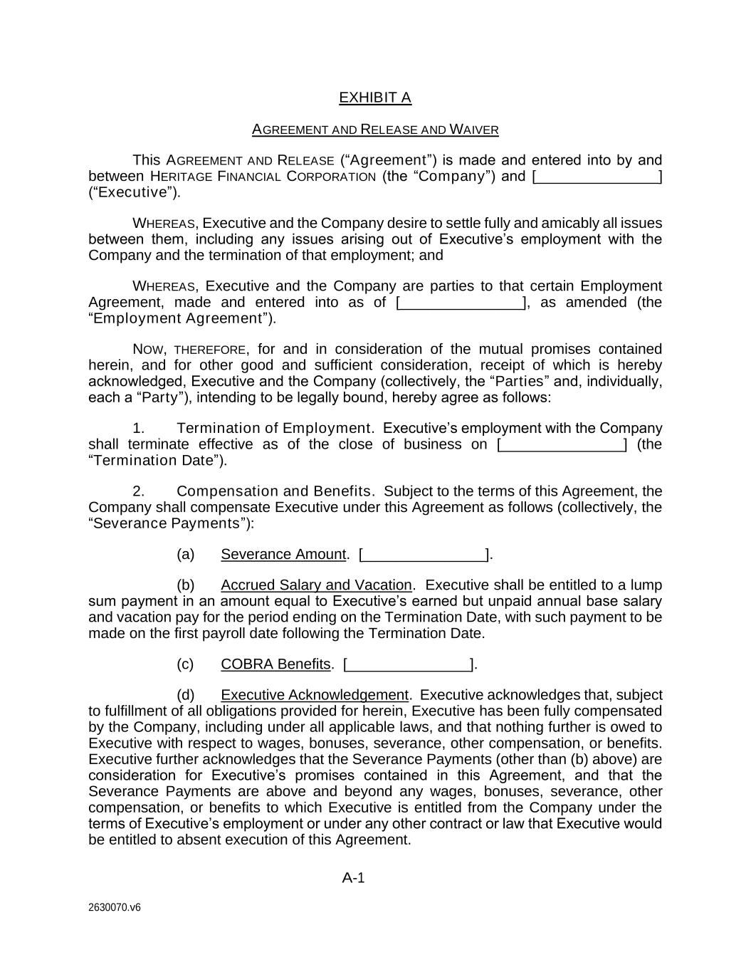 A-1 2630070.v6 EXHIBIT A AGREEMENT AND RELEASE AND WAIVER This AGREEMENT AND RELEASE (“Agreement”) is made and entered into by and between HERITAGE FINANCIAL CORPORATION (the “Company”) and [_______________] (“Executive”). WHEREAS, Executive and the Company desire to settle fully and amicably all issues between them, including any issues arising out of Executive’s employment with the Company and the termination of that employment; and WHEREAS, Executive and the Company are parties to that certain Employment Agreement, made and entered into as of [_______________], as amended (the “Employment Agreement”). NOW, THEREFORE, for and in consideration of the mutual promises contained herein, and for other good and sufficient consideration, receipt of which is hereby acknowledged, Executive and the Company (collectively, the “Parties” and, individually, each a “Party”), intending to be legally bound, hereby agree as follows: 1. Termination of Employment. Executive’s employment with the Company shall terminate effective as of the close of business on [_______________] (the “Termination Date”). 2. Compensation and Benefits. Subject to the terms of this Agreement, the Company shall compensate Executive under this Agreement as follows (collectively, the “Severance Payments”): (a) Severance Amount. [_______________]. (b) Accrued Salary and Vacation. Executive shall be entitled to a lump sum payment in an amount equal to Executive’s earned but unpaid annual base salary and vacation pay for the period ending on the Termination Date, with such payment to be made on the first payroll date following the Termination Date. (c) COBRA Benefits. [_______________]. (d) Executive Acknowledgement. Executive acknowledges that, subject to fulfillment of all obligations provided for herein, Executive has been fully compensated by the Company, including under all applicable laws, and that nothing further is owed to Executive with respect to wages, bonuses, severance, other compensation, or benefits. Executive further acknowledges that the Severance Payments (other than (b) above) are consideration for Executive’s promises contained in this Agreement, and that the Severance Payments are above and beyond any wages, bonuses, severance, other compensation, or benefits to which Executive is entitled from the Company under the terms of Executive’s employment or under any other contract or law that Executive would be entitled to absent execution of this Agreement.
