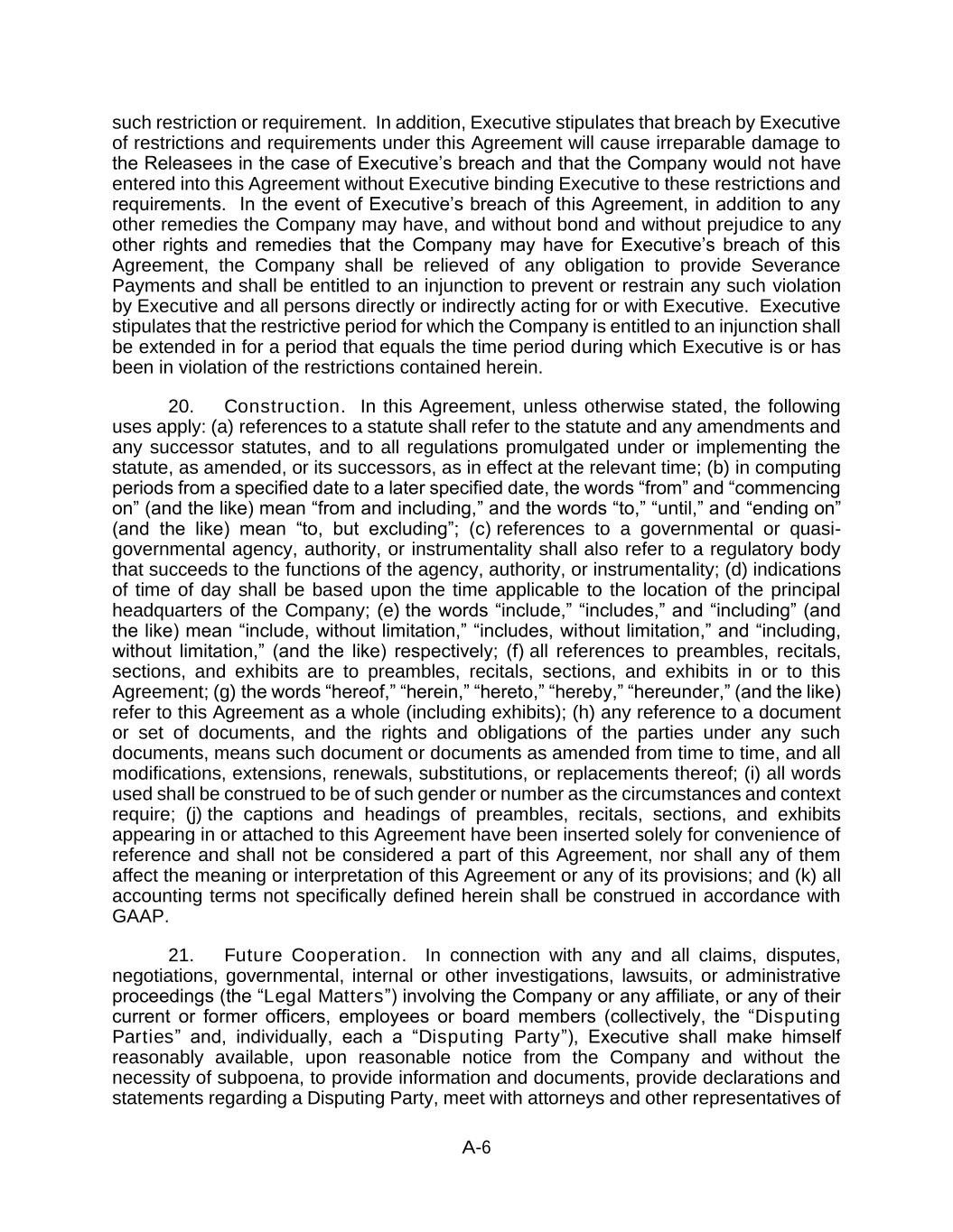 A-6 such restriction or requirement. In addition, Executive stipulates that breach by Executive of restrictions and requirements under this Agreement will cause irreparable damage to the Releasees in the case of Executive’s breach and that the Company would not have entered into this Agreement without Executive binding Executive to these restrictions and requirements. In the event of Executive’s breach of this Agreement, in addition to any other remedies the Company may have, and without bond and without prejudice to any other rights and remedies that the Company may have for Executive’s breach of this Agreement, the Company shall be relieved of any obligation to provide Severance Payments and shall be entitled to an injunction to prevent or restrain any such violation by Executive and all persons directly or indirectly acting for or with Executive. Executive stipulates that the restrictive period for which the Company is entitled to an injunction shall be extended in for a period that equals the time period during which Executive is or has been in violation of the restrictions contained herein. 20. Construction. In this Agreement, unless otherwise stated, the following uses apply: (a) references to a statute shall refer to the statute and any amendments and any successor statutes, and to all regulations promulgated under or implementing the statute, as amended, or its successors, as in effect at the relevant time; (b) in computing periods from a specified date to a later specified date, the words “from” and “commencing on” (and the like) mean “from and including,” and the words “to,” “until,” and “ending on” (and the like) mean “to, but excluding”; (c) references to a governmental or quasi- governmental agency, authority, or instrumentality shall also refer to a regulatory body that succeeds to the functions of the agency, authority, or instrumentality; (d) indications of time of day shall be based upon the time applicable to the location of the principal headquarters of the Company; (e) the words “include,” “includes,” and “including” (and the like) mean “include, without limitation,” “includes, without limitation,” and “including, without limitation,” (and the like) respectively; (f) all references to preambles, recitals, sections, and exhibits are to preambles, recitals, sections, and exhibits in or to this Agreement; (g) the words “hereof,” “herein,” “hereto,” “hereby,” “hereunder,” (and the like) refer to this Agreement as a whole (including exhibits); (h) any reference to a document or set of documents, and the rights and obligations of the parties under any such documents, means such document or documents as amended from time to time, and all modifications, extensions, renewals, substitutions, or replacements thereof; (i) all words used shall be construed to be of such gender or number as the circumstances and context require; (j) the captions and headings of preambles, recitals, sections, and exhibits appearing in or attached to this Agreement have been inserted solely for convenience of reference and shall not be considered a part of this Agreement, nor shall any of them affect the meaning or interpretation of this Agreement or any of its provisions; and (k) all accounting terms not specifically defined herein shall be construed in accordance with GAAP. 21. Future Cooperation. In connection with any and all claims, disputes, negotiations, governmental, internal or other investigations, lawsuits, or administrative proceedings (the “Legal Matters”) involving the Company or any affiliate, or any of their current or former officers, employees or board members (collectively, the “Disputing Parties” and, individually, each a “Disputing Party”), Executive shall make himself reasonably available, upon reasonable notice from the Company and without the necessity of subpoena, to provide information and documents, provide declarations and statements regarding a Disputing Party, meet with attorneys and other representatives of