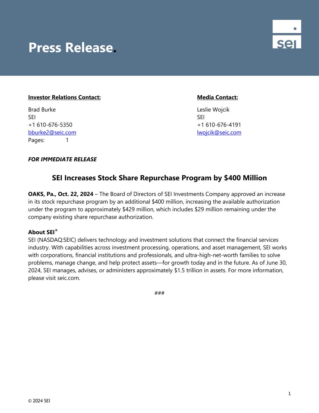 © 2024 SEI 1 Investor Relations Contact: Media Contact: Brad Burke Leslie Wojcik SEI SEI +1 610-676-5350 +1 610-676-4191 bburke2@seic.com lwojcik@seic.com Pages: 1 FOR IMMEDIATE RELEASE SEI Increases Stock Share Repurchase Program by $400 Million OAKS, Pa., Oct. 22, 2024 – The Board of Directors of SEI Investments Company approved an increase in its stock repurchase program by an additional $400 million, increasing the available authorization under the program to approximately $429 million, which includes $29 million remaining under the company existing share repurchase authorization. About SEI® SEI (NASDAQ:SEIC) delivers technology and investment solutions that connect the financial services industry. With capabilities across investment processing, operations, and asset management, SEI works with corporations, financial institutions and professionals, and ultra-high-net-worth families to solve problems, manage change, and help protect assets—for growth today and in the future. As of June 30, 2024, SEI manages, advises, or administers approximately $1.5 trillion in assets. For more information, please visit seic.com. ### Press Release.