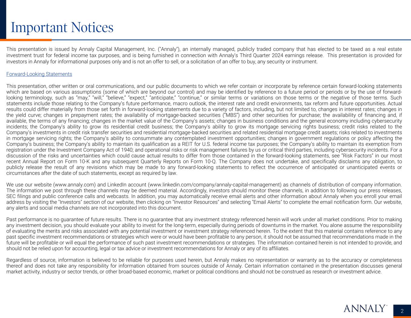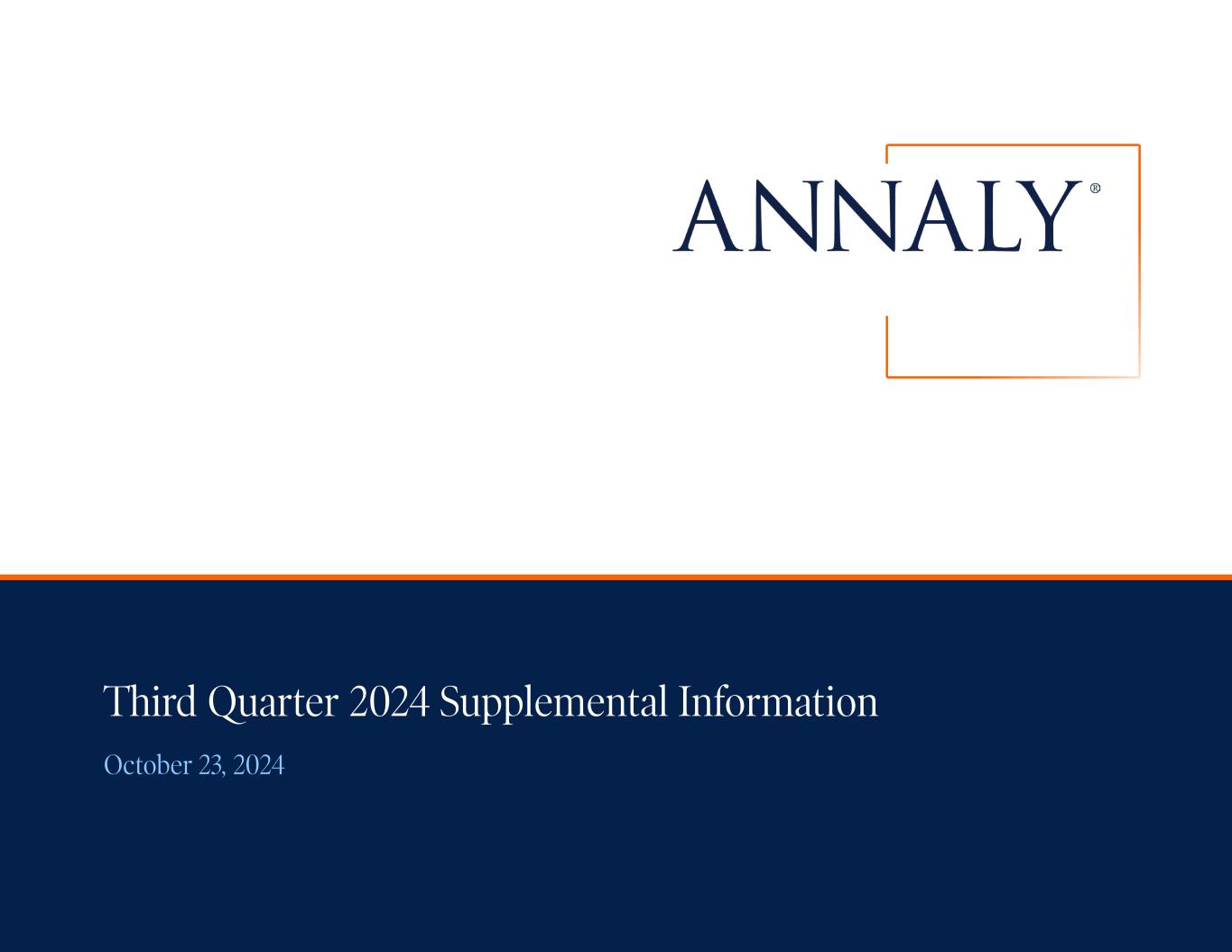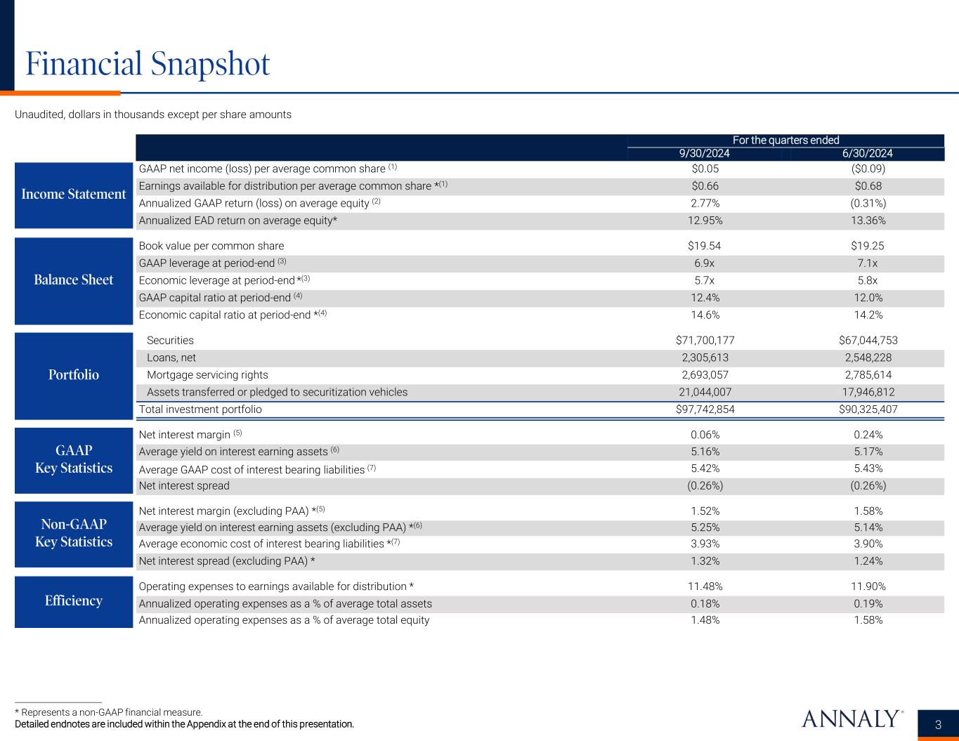 Important Notices 2 This presentation is issued by Annaly Capital Management, Inc. ("Annaly"), an internally managed, publicly traded company that has elected to be taxed as a real estate investment trust for federal income tax purposes, and is being furnished in connection with Annaly’s Third Quarter 2024 earnings release. This presentation is provided for investors in Annaly for informational purposes only and is not an offer to sell, or a solicitation of an offer to buy, any security or instrument. Forward-Looking Statements This presentation, other written or oral communications, and our public documents to which we refer contain or incorporate by reference certain forward-looking statements which are based on various assumptions (some of which are beyond our control) and may be identified by reference to a future period or periods or by the use of forward- looking terminology, such as “may,” “will,” “believe,” “expect,” “anticipate,” “continue,” or similar terms or variations on those terms or the negative of those terms. Such statements include those relating to the Company’s future performance, macro outlook, the interest rate and credit environments, tax reform and future opportunities. Actual results could differ materially from those set forth in forward-looking statements due to a variety of factors, including, but not limited to, changes in interest rates; changes in the yield curve; changes in prepayment rates; the availability of mortgage-backed securities (“MBS”) and other securities for purchase; the availability of financing and, if available, the terms of any financing; changes in the market value of the Company’s assets; changes in business conditions and the general economy including cybersecurity incidents; the Company’s ability to grow its residential credit business; the Company's ability to grow its mortgage servicing rights business; credit risks related to the Company’s investments in credit risk transfer securities and residential mortgage-backed securities and related residential mortgage credit assets; risks related to investments in mortgage servicing rights; the Company’s ability to consummate any contemplated investment opportunities; changes in government regulations or policy affecting the Company’s business; the Company’s ability to maintain its qualification as a REIT for U.S. federal income tax purposes; the Company’s ability to maintain its exemption from registration under the Investment Company Act of 1940; and operational risks or risk management failures by us or critical third parties, including cybersecurity incidents. For a discussion of the risks and uncertainties which could cause actual results to differ from those contained in the forward-looking statements, see “Risk Factors” in our most recent Annual Report on Form 10-K and any subsequent Quarterly Reports on Form 10-Q. The Company does not undertake, and specifically disclaims any obligation, to publicly release the result of any revisions which may be made to any forward-looking statements to reflect the occurrence of anticipated or unanticipated events or circumstances after the date of such statements, except as required by law. We use our website (www.annaly.com) and LinkedIn account (www.linkedin.com/company/annaly-capital-management) as channels of distribution of company information. The information we post through these channels may be deemed material. Accordingly, investors should monitor these channels, in addition to following our press releases, SEC filings and public conference calls and webcasts. In addition, you may automatically receive email alerts and other information about Annaly when you enroll your email address by visiting the "Investors" section of our website, then clicking on "Investor Resources" and selecting "Email Alerts" to complete the email notification form. Our website, any alerts and social media channels are not incorporated into this document. Past performance is no guarantee of future results. There is no guarantee that any investment strategy referenced herein will work under all market conditions. Prior to making any investment decision, you should evaluate your ability to invest for the long-term, especially during periods of downturns in the market. You alone assume the responsibility of evaluating the merits and risks associated with any potential investment or investment strategy referenced herein. To the extent that this material contains reference to any past specific investment recommendations or strategies which were or would have been profitable to any person, it should not be assumed that recommendations made in the future will be profitable or will equal the performance of such past investment recommendations or strategies. The information contained herein is not intended to provide, and should not be relied upon for accounting, legal or tax advice or investment recommendations for Annaly or any of its affiliates. Regardless of source, information is believed to be reliable for purposes used herein, but Annaly makes no representation or warranty as to the accuracy or completeness thereof and does not take any responsibility for information obtained from sources outside of Annaly. Certain information contained in the presentation discusses general market activity, industry or sector trends, or other broad-based economic, market or political conditions and should not be construed as research or investment advice.