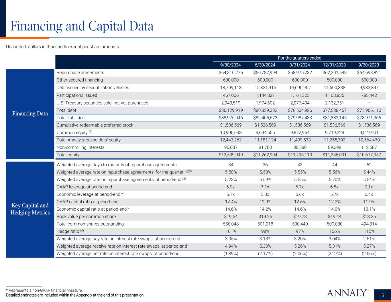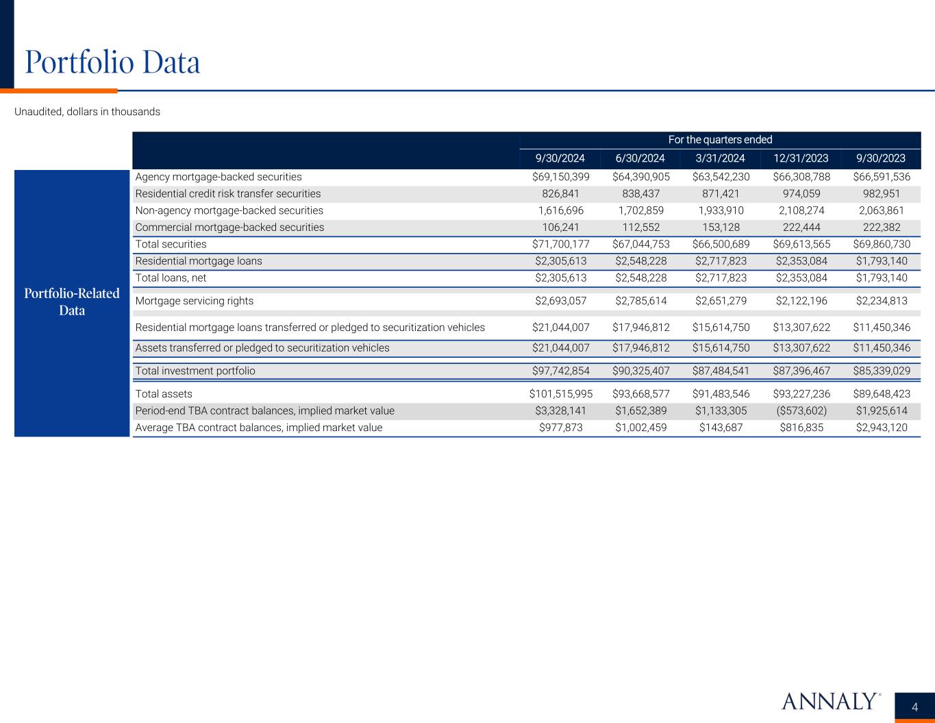 Portfolio Data 4 Unaudited, dollars in thousands Portfolio-Related Data For the quarters ended 9/30/2024 6/30/2024 3/31/2024 12/31/2023 9/30/2023 Agency mortgage-backed securities $69,150,399 $64,390,905 $63,542,230 $66,308,788 $66,591,536 Residential credit risk transfer securities 826,841 838,437 871,421 974,059 982,951 Non-agency mortgage-backed securities 1,616,696 1,702,859 1,933,910 2,108,274 2,063,861 Commercial mortgage-backed securities 106,241 112,552 153,128 222,444 222,382 Total securities $71,700,177 $67,044,753 $66,500,689 $69,613,565 $69,860,730 Residential mortgage loans $2,305,613 $2,548,228 $2,717,823 $2,353,084 $1,793,140 Total loans, net $2,305,613 $2,548,228 $2,717,823 $2,353,084 $1,793,140 Mortgage servicing rights $2,693,057 $2,785,614 $2,651,279 $2,122,196 $2,234,813 Residential mortgage loans transferred or pledged to securitization vehicles $21,044,007 $17,946,812 $15,614,750 $13,307,622 $11,450,346 Assets transferred or pledged to securitization vehicles $21,044,007 $17,946,812 $15,614,750 $13,307,622 $11,450,346 Total investment portfolio $97,742,854 $90,325,407 $87,484,541 $87,396,467 $85,339,029 Total assets $101,515,995 $93,668,577 $91,483,546 $93,227,236 $89,648,423 Period-end TBA contract balances, implied market value $3,328,141 $1,652,389 $1,133,305 ($573,602) $1,925,614 Average TBA contract balances, implied market value $977,873 $1,002,459 $143,687 $816,835 $2,943,120