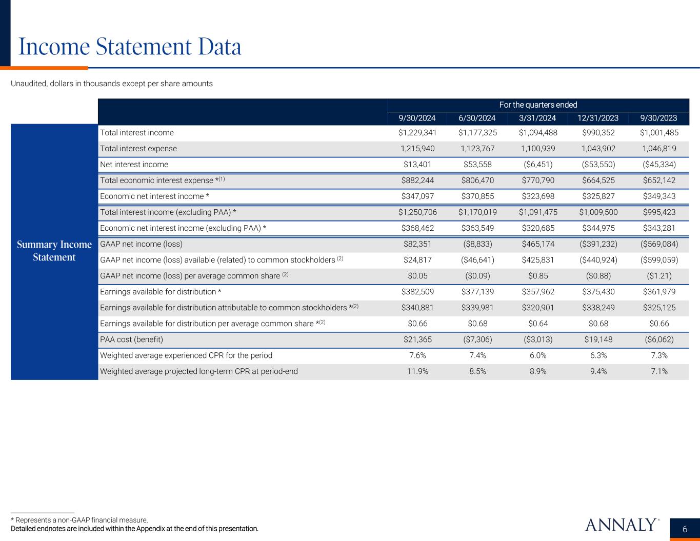 Financing and Capital Data 5 Unaudited, dollars in thousands except per share amounts * Represents a non-GAAP financial measure. Detailed endnotes are included within the Appendix at the end of this presentation. For the quarters ended 9/30/2024 6/30/2024 3/31/2024 12/31/2023 9/30/2023 Repurchase agreements $64,310,276 $60,787,994 $58,975,232 $62,201,543 $64,693,821 Other secured financing 600,000 600,000 600,000 500,000 500,000 Debt issued by securitization vehicles 18,709,118 15,831,915 13,690,967 11,600,338 9,983,847 Participations issued 467,006 1,144,821 1,161,323 1,103,835 788,442 U.S. Treasury securities sold, not yet purchased 2,043,519 1,974,602 2,077,404 2,132,751 — Total debt $86,129,919 $80,339,332 $76,504,926 $77,538,467 $75,966,110 Total liabilities $88,976,046 $82,405,673 $79,987,433 $81,882,145 $78,971,366 Cumulative redeemable preferred stock $1,536,569 $1,536,569 $1,536,569 $1,536,569 $1,536,569 Common equity (1) 10,906,693 9,644,555 9,872,964 9,719,224 9,027,901 Total Annaly stockholders' equity 12,443,262 11,181,124 11,409,533 11,255,793 10,564,470 Non-controlling interests 96,687 81,780 86,580 89,298 112,587 Total equity $12,539,949 $11,262,904 $11,496,113 $11,345,091 $10,677,057 Weighted average days to maturity of repurchase agreements 34 36 43 44 52 Weighted average rate on repurchase agreements, for the quarter (2)(3) 5.50% 5.53% 5.55% 5.56% 5.44% Weighted average rate on repurchase agreements, at period-end (3) 5.23% 5.59% 5.55% 5.70% 5.54% GAAP leverage at period-end 6.9x 7.1x 6.7x 6.8x 7.1x Economic leverage at period-end * 5.7x 5.8x 5.6x 5.7x 6.4x GAAP capital ratio at period-end 12.4% 12.0% 12.6% 12.2% 11.9% Economic capital ratio at period-end * 14.6% 14.2% 14.6% 14.0% 13.1% Book value per common share $19.54 $19.25 $19.73 $19.44 $18.25 Total common shares outstanding 558,048 501,018 500,440 500,080 494,814 Hedge ratio (4) 101% 98% 97% 106% 115% Weighted average pay rate on interest rate swaps, at period-end 3.05% 3.13% 3.20% 3.04% 2.61% Weighted average receive rate on interest rate swaps, at period-end 4.94% 5.30% 5.26% 5.31% 5.27% Weighted average net rate on interest rate swaps, at period-end (1.89%) (2.17%) (2.06%) (2.27%) (2.66%) Financing Data Key Capital and Hedging Metrics