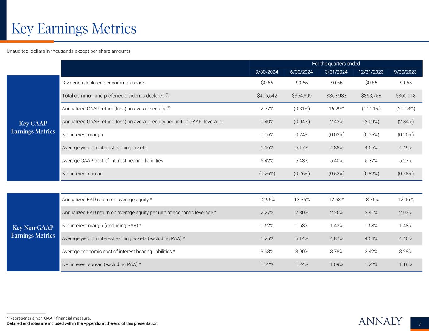 Income Statement Data 6 Unaudited, dollars in thousands except per share amounts * Represents a non-GAAP financial measure. Detailed endnotes are included within the Appendix at the end of this presentation. For the quarters ended 9/30/2024 6/30/2024 3/31/2024 12/31/2023 9/30/2023 Total interest income $1,229,341 $1,177,325 $1,094,488 $990,352 $1,001,485 Total interest expense 1,215,940 1,123,767 1,100,939 1,043,902 1,046,819 Net interest income $13,401 $53,558 ($6,451) ($53,550) ($45,334) Total economic interest expense *(1) $882,244 $806,470 $770,790 $664,525 $652,142 Economic net interest income * $347,097 $370,855 $323,698 $325,827 $349,343 Total interest income (excluding PAA) * $1,250,706 $1,170,019 $1,091,475 $1,009,500 $995,423 Economic net interest income (excluding PAA) * $368,462 $363,549 $320,685 $344,975 $343,281 GAAP net income (loss) $82,351 ($8,833) $465,174 ($391,232) ($569,084) GAAP net income (loss) available (related) to common stockholders (2) $24,817 ($46,641) $425,831 ($440,924) ($599,059) GAAP net income (loss) per average common share (2) $0.05 ($0.09) $0.85 ($0.88) ($1.21) Earnings available for distribution * $382,509 $377,139 $357,962 $375,430 $361,979 Earnings available for distribution attributable to common stockholders *(2) $340,881 $339,981 $320,901 $338,249 $325,125 Earnings available for distribution per average common share *(2) $0.66 $0.68 $0.64 $0.68 $0.66 PAA cost (benefit) $21,365 ($7,306) ($3,013) $19,148 ($6,062) Weighted average experienced CPR for the period 7.6% 7.4% 6.0% 6.3% 7.3% Weighted average projected long-term CPR at period-end 11.9% 8.5% 8.9% 9.4% 7.1% Summary Income Statement