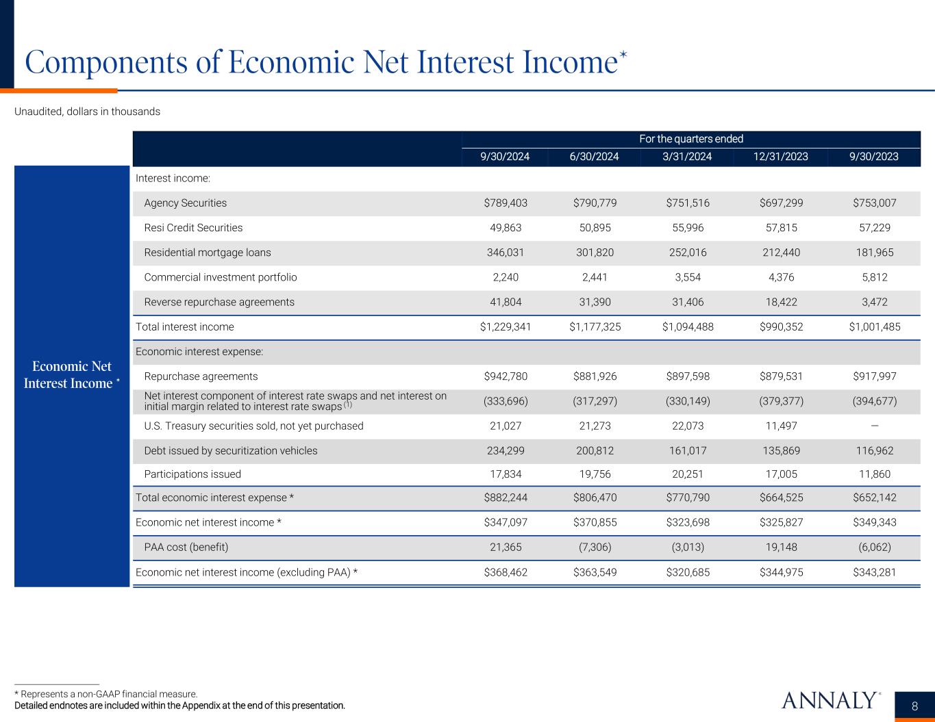 Key Earnings Metrics 7 Unaudited, dollars in thousands except per share amounts * Represents a non-GAAP financial measure. Detailed endnotes are included within the Appendix at the end of this presentation. For the quarters ended 9/30/2024 6/30/2024 3/31/2024 12/31/2023 9/30/2023 Dividends declared per common share $0.65 $0.65 $0.65 $0.65 $0.65 Total common and preferred dividends declared (1) $406,542 $364,899 $363,933 $363,758 $360,018 Annualized GAAP return (loss) on average equity (2) 2.77% (0.31%) 16.29% (14.21%) (20.18%) Annualized GAAP return (loss) on average equity per unit of GAAP leverage 0.40% (0.04%) 2.43% (2.09%) (2.84%) Net interest margin 0.06% 0.24% (0.03%) (0.25%) (0.20%) Average yield on interest earning assets 5.16% 5.17% 4.88% 4.55% 4.49% Average GAAP cost of interest bearing liabilities 5.42% 5.43% 5.40% 5.37% 5.27% Net interest spread (0.26%) (0.26%) (0.52%) (0.82%) (0.78%) Annualized EAD return on average equity * 12.95% 13.36% 12.63% 13.76% 12.96% Annualized EAD return on average equity per unit of economic leverage * 2.27% 2.30% 2.26% 2.41% 2.03% Net interest margin (excluding PAA) * 1.52% 1.58% 1.43% 1.58% 1.48% Average yield on interest earning assets (excluding PAA) * 5.25% 5.14% 4.87% 4.64% 4.46% Average economic cost of interest bearing liabilities * 3.93% 3.90% 3.78% 3.42% 3.28% Net interest spread (excluding PAA) * 1.32% 1.24% 1.09% 1.22% 1.18% Key GAAP Earnings Metrics Key Non-GAAP Earnings Metrics