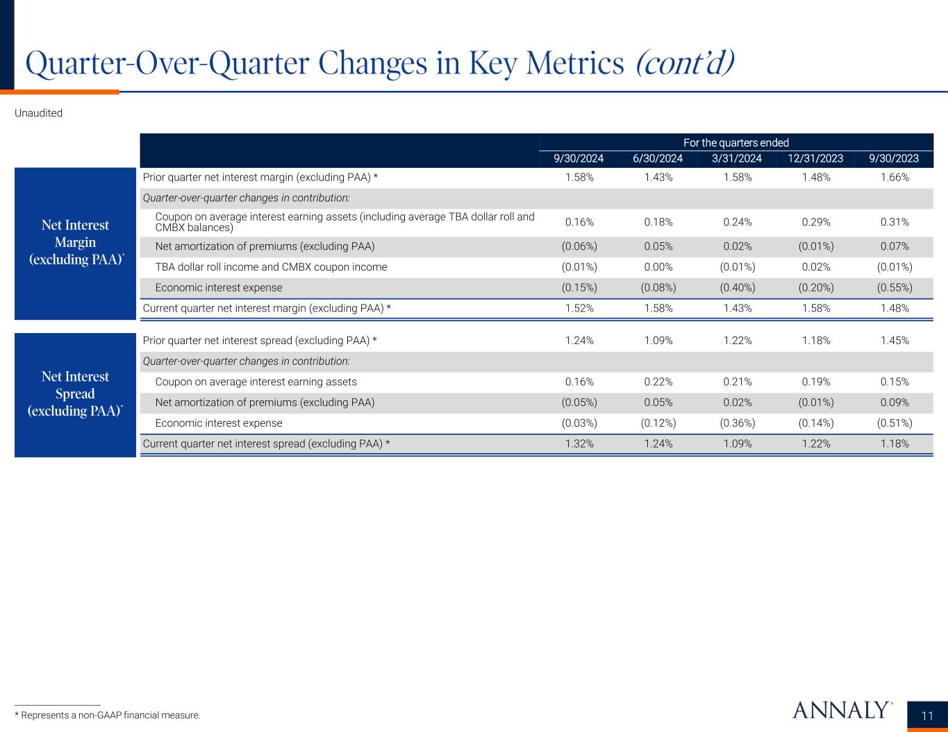 Quarter-Over-Quarter Changes in Key Metrics 10 Unaudited For the quarters ended 9/30/2024 6/30/2024 3/31/2024 12/31/2023 9/30/2023 Book value per common share, beginning of period $19.25 $19.73 $19.44 $18.25 $20.73 Net income (loss) available (related) to common stockholders 0.05 (0.09) 0.85 (0.88) (1.21) Other comprehensive income (loss) attributable to common stockholders 0.86 0.25 0.11 2.72 (0.63) Common dividends declared (0.65) (0.65) (0.65) (0.65) (0.65) Issuance / buyback of common stock / redemption of preferred stock 0.03 0.01 (0.02) — 0.01 Book value per common share, end of period $19.54 $19.25 $19.73 $19.44 $18.25 Prior quarter net interest margin 0.24% (0.03%) (0.25%) (0.20%) (0.15%) Quarter-over-quarter changes in contribution: Coupon on average interest earning assets 0.16% 0.22% 0.21% 0.19% 0.16% Net amortization of premiums (0.18%) 0.07% 0.12% (0.13%) 0.06% GAAP interest expense (0.16%) (0.02%) (0.11%) (0.11%) (0.27%) Current quarter net interest margin 0.06% 0.24% (0.03%) (0.25%) (0.20%) Prior quarter net interest spread (0.26%) (0.52%) (0.82%) (0.78%) (0.73%) Quarter-over-quarter changes in contribution: Coupon on average interest earning assets 0.16% 0.22% 0.21% 0.19% 0.16% Net amortization of premiums (0.18%) 0.07% 0.12% (0.13%) 0.06% GAAP interest expense 0.02% (0.03%) (0.03%) (0.10%) (0.27%) Current quarter net interest spread (0.26%) (0.26%) (0.52%) (0.82%) (0.78%) Book Value Rollforward Net Interest Margin Net Interest Spread