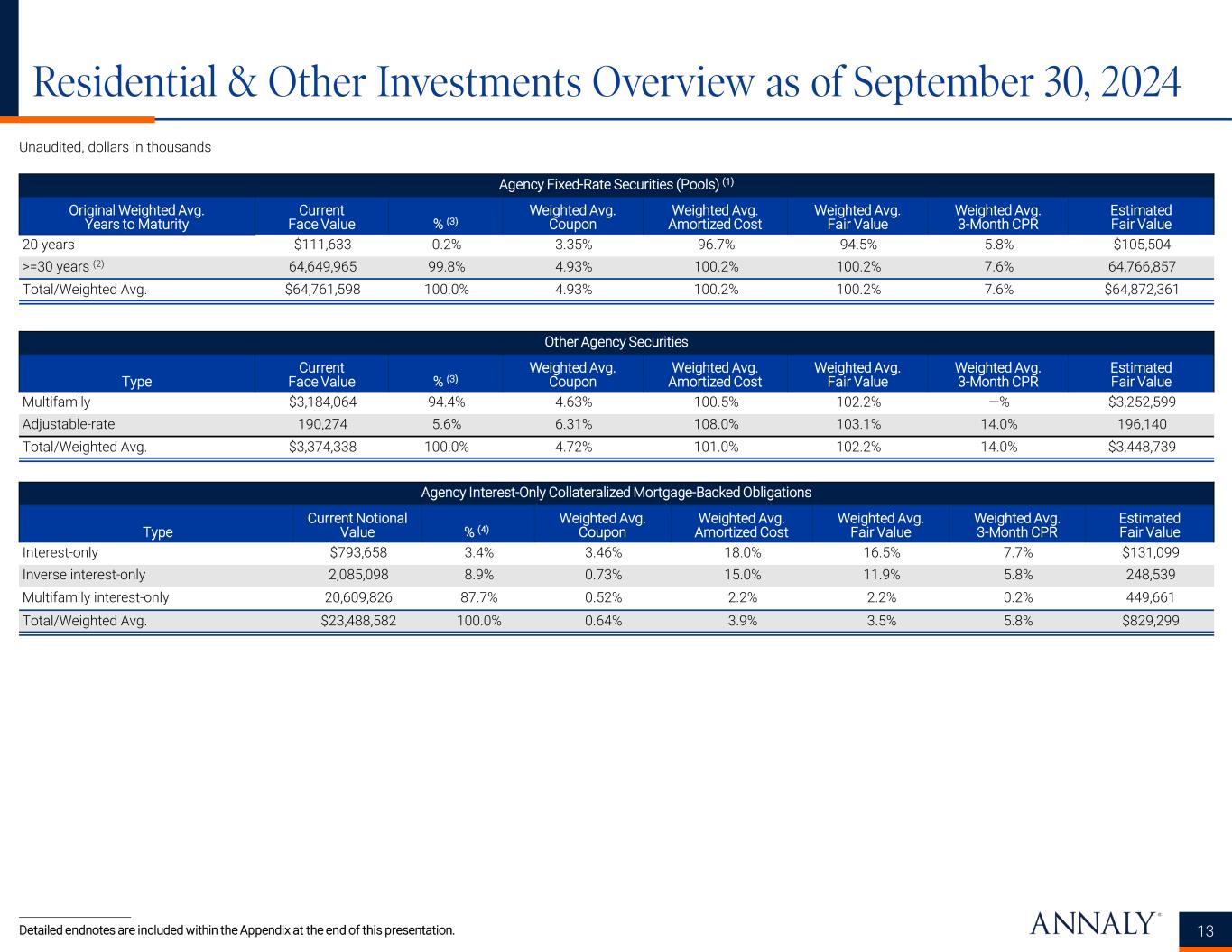 Quarter-Over-Quarter Changes in Annualized Return on Average Equity 12 Unaudited * Represents a non-GAAP financial measure. Detailed endnotes are included within the Appendix at the end of this presentation. For the quarters ended 9/30/2024 6/30/2024 3/31/2024 12/31/2023 9/30/2023 Prior quarter annualized GAAP return (loss) on average equity (0.31%) 16.29% (14.21%) (20.18%) 5.42% Quarter-over-quarter changes in contribution: Coupon income 1.37% 2.50% 1.41% 1.44% 4.18% Net amortization of premiums and accretion of discounts (1.43%) 0.55% 0.95% (0.97%) 0.35% GAAP interest expense (1.37%) (0.94%) (0.64%) (0.81%) (5.06%) Net servicing income (0.11%) 0.19% 0.43% 0.05% 0.60% Net gains (losses) on investments and other 77.92% 14.83% (103.65%) 165.02% (52.19%) Net gains (losses) on derivatives (74.08%) (33.10%) 131.85% (159.04%) 25.83% Other (1) 0.78% (0.63%) 0.15% 0.28% 0.69% Current quarter annualized GAAP return (loss) on average equity 2.77% (0.31%) 16.29% (14.21%) (20.18%) Prior quarter annualized EAD return on average equity * 13.36% 12.63% 13.76% 12.96% 13.22% Quarter-over-quarter changes in contribution: Coupon income 1.39% 2.50% 1.36% 1.42% 4.23% Net amortization of premiums (excluding PAA) (0.47%) 0.41% 0.15% (0.06%) 0.54% Economic interest expense (1.32%) (1.35%) (2.84%) (1.01%) (5.42%) Net servicing income (0.11%) 0.19% 0.43% 0.05% 0.61% TBA dollar roll income and CMBX coupon income (0.06%) (0.03%) (0.01%) 0.10% (0.10%) Other (2) 0.16% (0.99%) (0.22%) 0.30% (0.12%) Current quarter annualized EAD return on average equity * 12.95% 13.36% 12.63% 13.76% 12.96% Annualized GAAP Return (Loss) on Average Equity Annualized EAD Return on Average Equity*