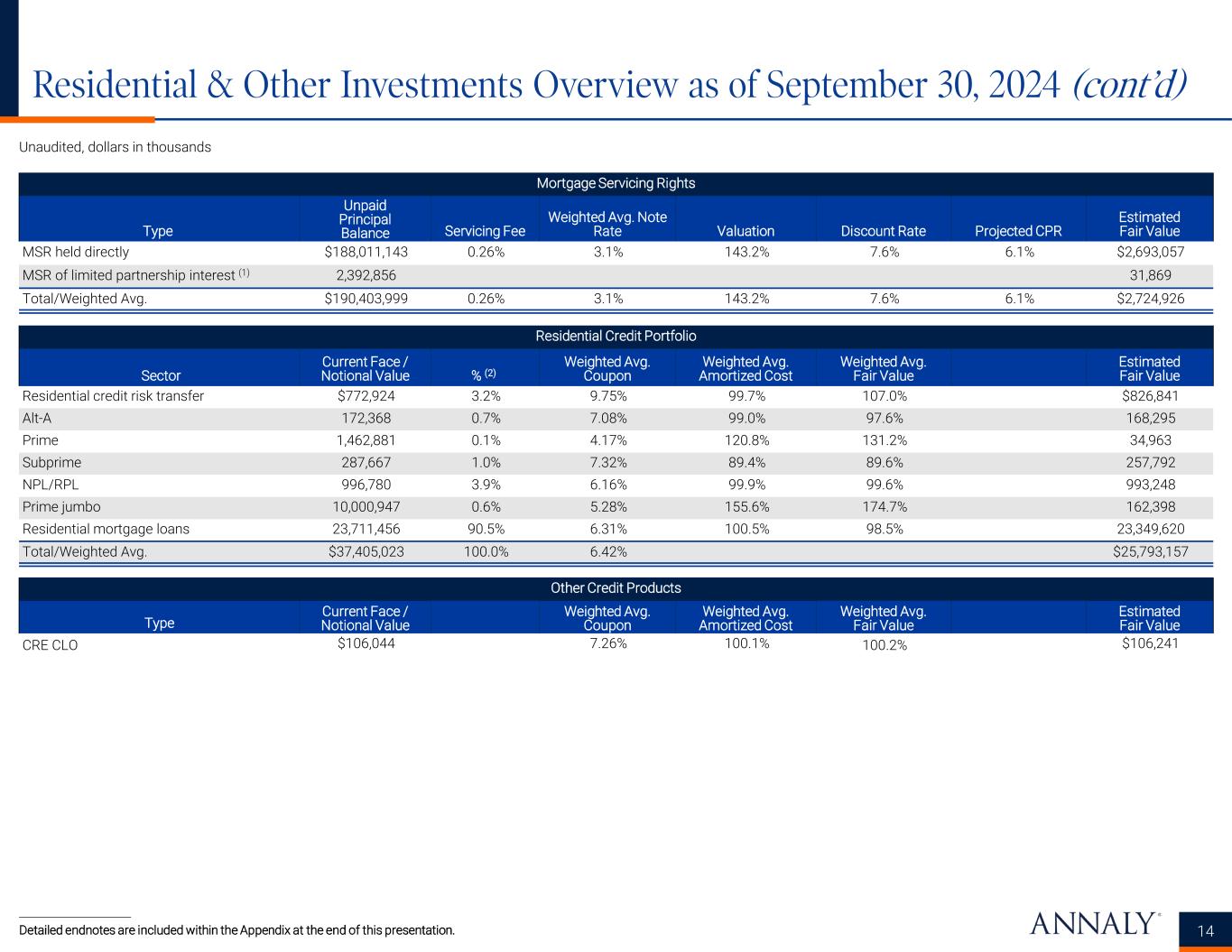 Residential & Other Investments Overview as of September 30, 2024 13 Unaudited, dollars in thousands Detailed endnotes are included within the Appendix at the end of this presentation. Agency Fixed-Rate Securities (Pools) (1) Original Weighted Avg. Years to Maturity Current Face Value % (3) Weighted Avg. Coupon Weighted Avg. Amortized Cost Weighted Avg. Fair Value Weighted Avg. 3-Month CPR Estimated Fair Value 20 years $111,633 0.2% 3.35% 96.7% 94.5% 5.8% $105,504 >=30 years (2) 64,649,965 99.8% 4.93% 100.2% 100.2% 7.6% 64,766,857 Total/Weighted Avg. $64,761,598 100.0% 4.93% 100.2% 100.2% 7.6% $64,872,361 Other Agency Securities Type Current Face Value % (3) Weighted Avg. Coupon Weighted Avg. Amortized Cost Weighted Avg. Fair Value Weighted Avg. 3-Month CPR Estimated Fair Value Multifamily $3,184,064 94.4% 4.63% 100.5% 102.2% —% $3,252,599 Adjustable-rate 190,274 5.6% 6.31% 108.0% 103.1% 14.0% 196,140 Total/Weighted Avg. $3,374,338 100.0% 4.72% 101.0% 102.2% 14.0% $3,448,739 Agency Interest-Only Collateralized Mortgage-Backed Obligations Type Current Notional Value % (4) Weighted Avg. Coupon Weighted Avg. Amortized Cost Weighted Avg. Fair Value Weighted Avg. 3-Month CPR Estimated Fair Value Interest-only $793,658 3.4% 3.46% 18.0% 16.5% 7.7% $131,099 Inverse interest-only 2,085,098 8.9% 0.73% 15.0% 11.9% 5.8% 248,539 Multifamily interest-only 20,609,826 87.7% 0.52% 2.2% 2.2% 0.2% 449,661 Total/Weighted Avg. $23,488,582 100.0% 0.64% 3.9% 3.5% 5.8% $829,299
