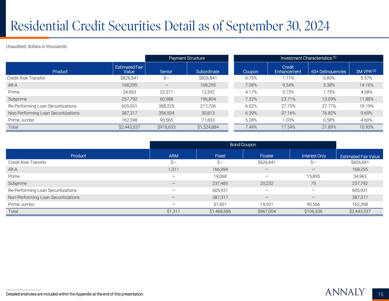 Residential & Other Investments Overview as of September 30, 2024 (cont’d) 14 Unaudited, dollars in thousands Detailed endnotes are included within the Appendix at the end of this presentation. Mortgage Servicing Rights Type Unpaid Principal Balance Servicing Fee Weighted Avg. Note Rate Valuation Discount Rate Projected CPR Estimated Fair Value MSR held directly $188,011,143 0.26% 3.1% 143.2% 7.6% 6.1% $2,693,057 MSR of limited partnership interest (1) 2,392,856 31,869 Total/Weighted Avg. $190,403,999 0.26% 3.1% 143.2% 7.6% 6.1% $2,724,926 Residential Credit Portfolio Sector Current Face / Notional Value % (2) Weighted Avg. Coupon Weighted Avg. Amortized Cost Weighted Avg. Fair Value Estimated Fair Value Residential credit risk transfer $772,924 3.2% 9.75% 99.7% 107.0% $826,841 Alt-A 172,368 0.7% 7.08% 99.0% 97.6% 168,295 Prime 1,462,881 0.1% 4.17% 120.8% 131.2% 34,963 Subprime 287,667 1.0% 7.32% 89.4% 89.6% 257,792 NPL/RPL 996,780 3.9% 6.16% 99.9% 99.6% 993,248 Prime jumbo 10,000,947 0.6% 5.28% 155.6% 174.7% 162,398 Residential mortgage loans 23,711,456 90.5% 6.31% 100.5% 98.5% 23,349,620 Total/Weighted Avg. $37,405,023 100.0% 6.42% $25,793,157 Other Credit Products Type Current Face / Notional Value Weighted Avg. Coupon Weighted Avg. Amortized Cost Weighted Avg. Fair Value Estimated Fair Value CRE CLO $106,044 7.26% 100.1% 100.2% $106,241