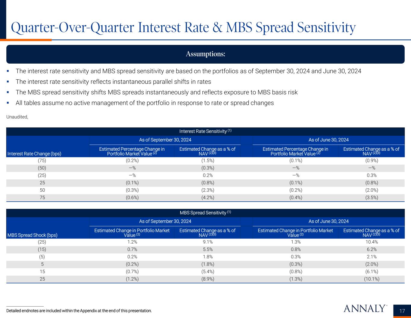 Hedging & Liabilities as of September 30, 2024 16 Unaudited, dollars in thousands Detailed endnotes are included within the Appendix at the end of this presentation. Principal Balance Weighted Average Rate Days to Maturity(5)At Period End For the Quarter Repurchase agreements $64,310,276 5.23% 5.50% 34 Other secured financing 600,000 7.95% 8.05% 317 Debt issued by securitization vehicles 19,307,363 5.27% 5.17% 12,937 Participations issued 448,907 7.35% 7.01% 10,888 Total indebtedness $84,666,546 Maturity Current Notional (1)(2) Weighted Avg. Pay Rate Weighted Avg. Receive Rate Weighted Avg. Years to Maturity(3) 0 to 3 years $19,961,229 3.33% 4.95% 1.05 > 3 to 6 years 13,510,021 3.10% 4.94% 4.62 > 6 to 10 years 20,114,937 2.77% 4.95% 7.97 Greater than 10 years 1,559,384 3.44% 4.84% 23.50 Total / Weighted Avg. $55,145,571 3.05% 4.94% 5.08 Type Current Underlying Notional Weighted Avg. Underlying Fixed Rate Weighted Avg. Underlying Floating Rate Weighted Avg. Underlying Years to Maturity Weighted Avg. Months to Expiration Long Pay $250,000 2.40% SOFR 5.03 0.23 Type Long Contracts Short Contracts Net Positions Weighted Avg. Years to Maturity U.S. Treasury Positions - 2 year $— ($16,793,200) ($16,793,200) 1.94 U.S. Treasury Positions - 5 year $3,346,000 $— $3,346,000 4.39 U.S. Treasury Positions - 10 year & greater $621,300 ($4,237,500) ($3,616,200) 11.30 Total / Weighted Avg. $3,967,300 ($21,030,700) ($17,063,400) 3.71 Maturity Principal Balance Weighted Avg. Rate At Period End Within 30 days $24,631,311 5.30% 30 to 59 days 34,814,805 5.11% 60 to 89 days 3,801,389 5.37% 90 to 119 days 131,078 5.90% Over 120 days(4) 1,531,693 7.36% Total / Weighted Avg. $64,910,276 5.25% Interest Rate Swaps Interest Rate Swaptions U.S. Treasury Hedging Positions Repurchase Agreements and Other Secured Financing Total Indebtedness