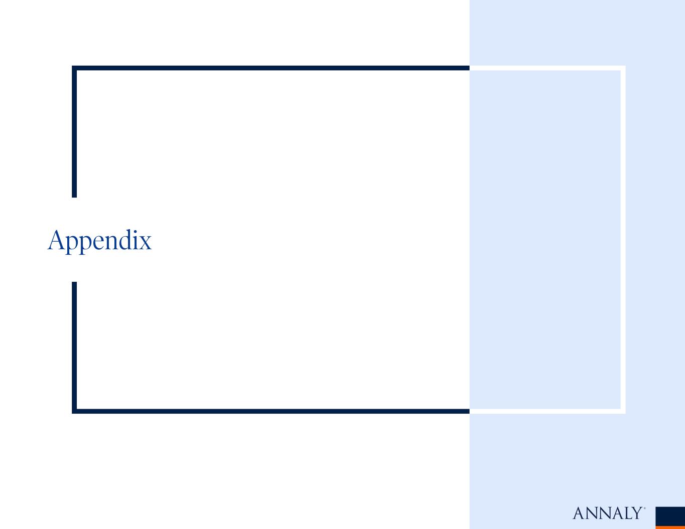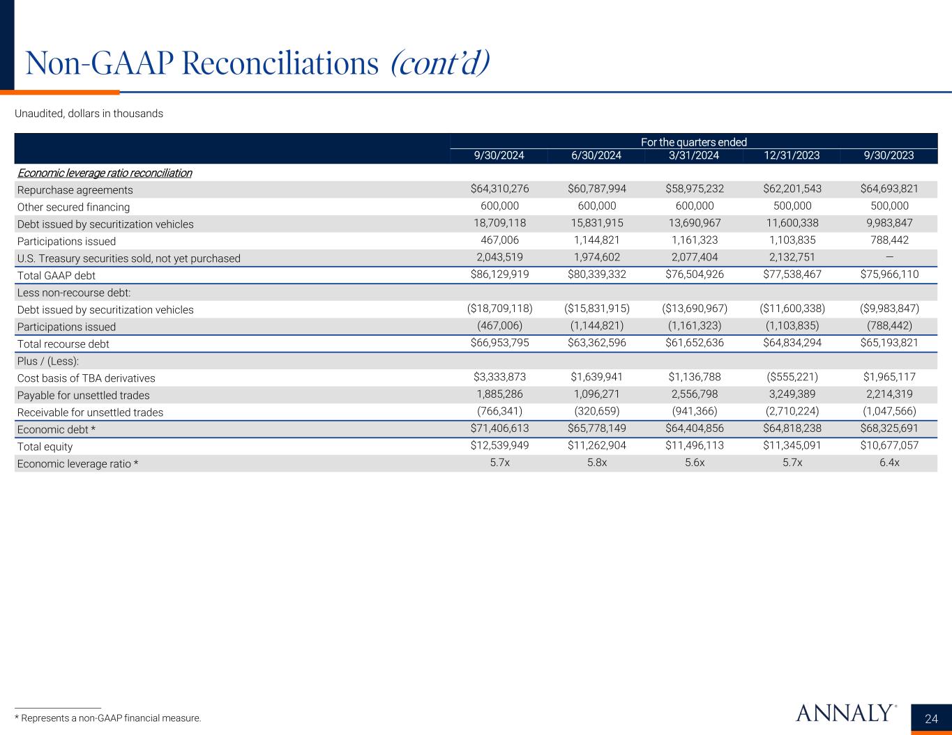 Non-GAAP Reconciliations (cont’d) 23 Economic leverage and economic capital ratios The Company uses capital coupled with borrowed funds to invest primarily in real estate related investments, earning the spread between the yield on its assets and the cost of its borrowings and hedging activities. The Company’s capital structure is designed to offer an efficient complement of funding sources to generate positive risk-adjusted returns for its stockholders while maintaining appropriate liquidity to support its business and meet the Company’s financial obligations under periods of market stress. To maintain its desired capital profile, the Company utilizes a mix of debt and equity funding. Debt funding may include the use of repurchase agreements, loans, securitizations, participations issued, lines of credit, asset backed lending facilities, corporate bond issuance, convertible bonds or other liabilities. Equity capital primarily consists of common and preferred stock. The Company’s economic leverage ratio is computed as the sum of recourse debt, cost basis of TBA derivatives outstanding, and net forward purchases (sales) of investments divided by total equity. Recourse debt consists of repurchase agreements, other secured financing, and U.S. Treasury securities sold, not yet purchased. Debt issued by securitization vehicles and participations issued are non-recourse to the Company and are excluded from economic leverage. Interest income (excluding PAA), economic interest expense and economic net interest income (excluding PAA) Interest income (excluding PAA) represents interest income excluding the effect of the PAA, and serves as the basis for deriving average yield on interest earning assets (excluding PAA), net interest spread (excluding PAA) and net interest margin (excluding PAA), which are discussed below. The Company believes this measure provides management and investors with additional detail to enhance their understanding of the Company’s operating results and trends by excluding the component of premium amortization expense representing the cumulative impact on prior periods, but not the current period, of quarter-over-quarter changes in estimated long-term prepayment speeds related to the Company’s Agency mortgage-backed securities (other than interest- only securities, multifamily and reverse mortgages), which can obscure underlying trends in the performance of the portfolio. Economic interest expense includes GAAP interest expense, the net interest component of interest rate swaps (which includes net interest on variation margin related to interest rate swaps) and net interest on initial margin related to interest rate swaps. The Company uses interest rate swaps to manage its exposure to changing interest rates on its repurchase agreements by economically hedging cash flows associated with these borrowings. Accordingly, adding the net interest component of interest rate swaps to interest expense, as computed in accordance with GAAP, reflects the total contractual interest expense and thus, provides investors with additional information about the cost of the Company's financing strategy. The Company may use market agreed coupon (“MAC”) interest rate swaps in which the Company may receive or make a payment at the time of entering into such interest rate swap to compensate for the off-market nature of such interest rate swap. In accordance with GAAP, upfront payments associated with MAC interest rate swaps are not reflected in the net interest component of interest rate swaps in the Company's Consolidated Statements of Comprehensive Income (Loss). Average yield on interest earning assets (excluding PAA), net interest spread (excluding PAA), net interest margin (excluding PAA) and average economic cost of interest bearing liabilities Net interest spread (excluding PAA), which is the difference between the average yield on interest earning assets (excluding PAA) and the average economic cost of interest bearing liabilities, which represents annualized economic interest expense divided by average interest bearing liabilities, and net interest margin (excluding PAA), which is calculated as the sum of interest income (excluding PAA) plus TBA dollar roll income less interest expense and the net interest component of interest rate swaps divided by the sum of average interest earning assets plus average TBA contract balances, provide management with additional measures of the Company’s profitability that management relies upon in monitoring the performance of the business.