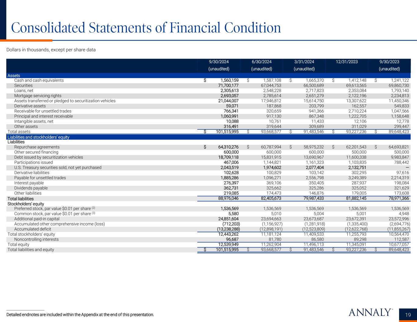 Consolidated Statements of Financial Condition 19 Dollars in thousands, except per share data Detailed endnotes are included within the Appendix at the end of this presentation. 9/30/2024 6/30/2024 3/31/2024 12/31/2023 9/30/2023 (unaudited) (unaudited) (unaudited) (unaudited) Assets Cash and cash equivalents $ 1,560,159 $ 1,587,108 $ 1,665,370 $ 1,412,148 $ 1,241,122 Securities 71,700,177 67,044,753 66,500,689 69,613,565 69,860,730 Loans, net 2,305,613 2,548,228 2,717,823 2,353,084 1,793,140 Mortgage servicing rights 2,693,057 2,785,614 2,651,279 2,122,196 2,234,813 Assets transferred or pledged to securitization vehicles 21,044,007 17,946,812 15,614,750 13,307,622 11,450,346 Derivative assets 59,071 187,868 203,799 162,557 549,833 Receivable for unsettled trades 766,341 320,659 941,366 2,710,224 1,047,566 Principal and interest receivable 1,060,991 917,130 867,348 1,222,705 1,158,648 Intangible assets, net 10,088 10,761 11,433 12,106 12,778 Other assets 316,491 319,644 309,689 311,029 299,447 Total assets $ 101,515,995 $ 93,668,577 $ 91,483,546 $ 93,227,236 $ 89,648,423 Liabilities and stockholders’ equity Liabilities Repurchase agreements $ 64,310,276 $ 60,787,994 $ 58,975,232 $ 62,201,543 $ 64,693,821 Other secured financing 600,000 600,000 600,000 500,000 500,000 Debt issued by securitization vehicles 18,709,118 15,831,915 13,690,967 11,600,338 9,983,847 Participations issued 467,006 1,144,821 1,161,323 1,103,835 788,442 U.S. Treasury securities sold, not yet purchased 2,043,519 1,974,602 2,077,404 2,132,751 — Derivative liabilities 102,628 100,829 103,142 302,295 97,616 Payable for unsettled trades 1,885,286 1,096,271 2,556,798 3,249,389 2,214,319 Interest payable 276,397 369,106 350,405 287,937 198,084 Dividends payable 362,731 325,662 325,286 325,052 321,629 Other liabilities 219,085 174,473 146,876 179,005 173,608 Total liabilities 88,976,046 82,405,673 79,987,433 81,882,145 78,971,366 Stockholders’ equity Preferred stock, par value $0.01 per share (2) 1,536,569 1,536,569 1,536,569 1,536,569 1,536,569 Common stock, par value $0.01 per share (3) 5,580 5,010 5,004 5,001 4,948 Additional paid-in capital 24,851,604 23,694,663 23,673,687 23,672,391 23,572,996 Accumulated other comprehensive income (loss) (712,203) (1,156,927) (1,281,918) (1,335,400) (2,694,776) Accumulated deficit (13,238,288) (12,898,191) (12,523,809) (12,622,768) (11,855,267) Total stockholders’ equity 12,443,262 11,181,124 11,409,533 11,255,793 10,564,470 Noncontrolling interests 96,687 81,780 86,580 89,298 112,587 Total equity 12,539,949 11,262,904 11,496,113 11,345,091 10,677,057 Total liabilities and equity $ 101,515,995 $ 93,668,577 $ 91,483,546 $ 93,227,236 $ 89,648,423