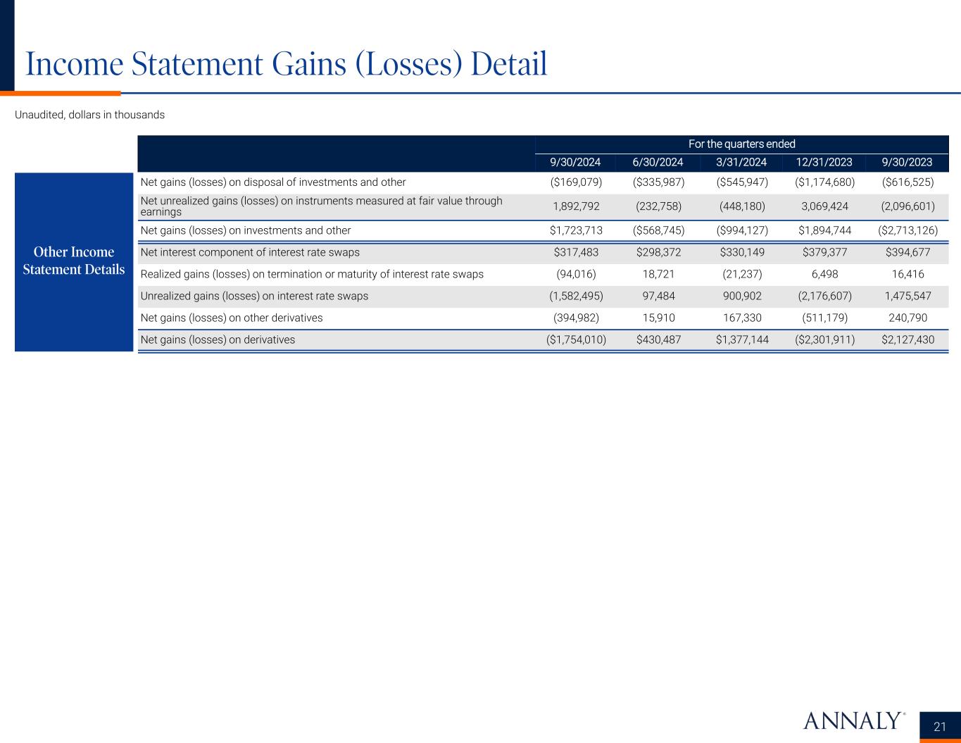 Consolidated Statements of Comprehensive Income (Loss) 20 Unaudited, dollars in thousands, except per share data For the quarters ended 9/30/2024 6/30/2024 3/31/2024 12/31/2023 9/30/2023 Net interest income Interest income $ 1,229,341 $ 1,177,325 $ 1,094,488 $ 990,352 $ 1,001,485 Interest expense 1,215,940 1,123,767 1,100,939 1,043,902 1,046,819 Net interest income 13,401 53,558 (6,451) (53,550) (45,334) Net servicing income Servicing and related income 122,583 120,515 115,084 98,474 97,620 Servicing and related expense 12,988 12,617 12,216 11,219 9,623 Net servicing income 109,595 107,898 102,868 87,255 87,997 Other income (loss) Net gains (losses) on investments and other 1,723,713 (568,745) (994,127) 1,894,744 (2,713,126) Net gains (losses) on derivatives (1,754,010) 430,487 1,377,144 (2,301,911) 2,127,430 Other, net 27,438 24,791 23,367 22,863 26,250 Total other income (loss) (2,859) (113,467) 406,384 (384,304) (559,446) General and administrative expenses Compensation expense 34,453 33,274 28,721 29,502 30,064 Other general and administrative expenses 9,468 11,617 9,849 9,399 9,845 Total general and administrative expenses 43,921 44,891 38,570 38,901 39,909 Income (loss) before income taxes 76,216 3,098 464,231 (389,500) (556,692) Income taxes (6,135) 11,931 (943) 1,732 12,392 Net income (loss) 82,351 (8,833) 465,174 (391,232) (569,084) Net income (loss) attributable to noncontrolling interests 15,906 650 2,282 12,511 (6,879) Net income (loss) attributable to Annaly 66,445 (9,483) 462,892 (403,743) (562,205) Dividends on preferred stock 41,628 37,158 37,061 37,181 36,854 Net income (loss) available (related) to common stockholders $ 24,817 $ (46,641) $ 425,831 $ (440,924) $ (599,059) Net income (loss) per share available (related) to common stockholders Basic $ 0.05 $ (0.09) $ 0.85 $ (0.88) $ (1.21) Diluted $ 0.05 $ (0.09) $ 0.85 $ (0.88) $ (1.21) Weighted average number of common shares outstanding Basic 515,729,658 500,950,563 500,612,840 499,871,725 494,330,361 Diluted 516,832,152 500,950,563 501,182,043 499,871,725 494,330,361 Other comprehensive income (loss) Net income (loss) $ 82,351 $ (8,833) $ 465,174 $ (391,232) $ (569,084) Unrealized gains (losses) on available-for-sale securities 428,955 (54,243) (281,869) 1,024,637 (825,286) Reclassification adjustment for net (gains) losses included in net income (loss) 15,769 179,234 335,351 334,739 513,041 Other comprehensive income (loss) 444,724 124,991 53,482 1,359,376 (312,245) Comprehensive income (loss) 527,075 116,158 518,656 968,144 (881,329) Comprehensive income (loss) attributable to noncontrolling interests 15,906 650 2,282 12,511 (6,879) Comprehensive income (loss) attributable to Annaly 511,169 115,508 516,374 955,633 (874,450) Dividends on preferred stock 41,628 37,158 37,061 37,181 36,854 Comprehensive income (loss) attributable to common stockholders $ 469,541 $ 78,350 $ 479,313 $ 918,452 $ (911,304)