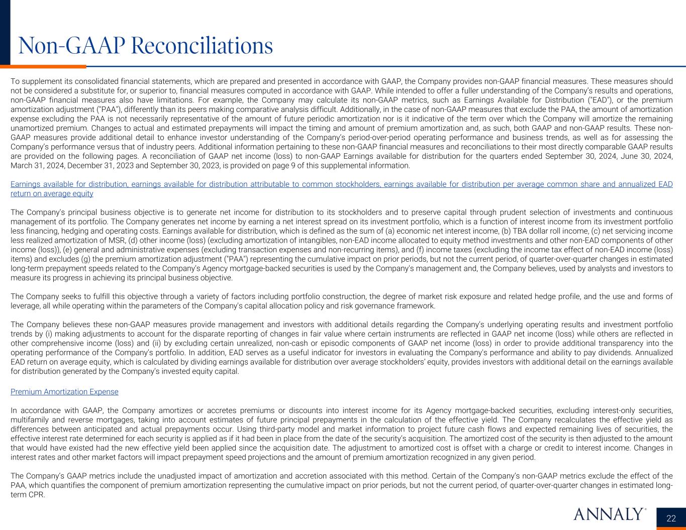 Non-GAAP Reconciliations 22 To supplement its consolidated financial statements, which are prepared and presented in accordance with GAAP, the Company provides non-GAAP financial measures. These measures should not be considered a substitute for, or superior to, financial measures computed in accordance with GAAP. While intended to offer a fuller understanding of the Company’s results and operations, non-GAAP financial measures also have limitations. For example, the Company may calculate its non-GAAP metrics, such as Earnings Available for Distribution ("EAD"), or the premium amortization adjustment ("PAA"), differently than its peers making comparative analysis difficult. Additionally, in the case of non-GAAP measures that exclude the PAA, the amount of amortization expense excluding the PAA is not necessarily representative of the amount of future periodic amortization nor is it indicative of the term over which the Company will amortize the remaining unamortized premium. Changes to actual and estimated prepayments will impact the timing and amount of premium amortization and, as such, both GAAP and non-GAAP results. These non- GAAP measures provide additional detail to enhance investor understanding of the Company’s period-over-period operating performance and business trends, as well as for assessing the Company’s performance versus that of industry peers. Additional information pertaining to these non-GAAP financial measures and reconciliations to their most directly comparable GAAP results are provided on the following pages. A reconciliation of GAAP net income (loss) to non-GAAP Earnings available for distribution for the quarters ended September 30, 2024, June 30, 2024, March 31, 2024, December 31, 2023 and September 30, 2023, is provided on page 9 of this supplemental information. Earnings available for distribution, earnings available for distribution attributable to common stockholders, earnings available for distribution per average common share and annualized EAD return on average equity The Company's principal business objective is to generate net income for distribution to its stockholders and to preserve capital through prudent selection of investments and continuous management of its portfolio. The Company generates net income by earning a net interest spread on its investment portfolio, which is a function of interest income from its investment portfolio less financing, hedging and operating costs. Earnings available for distribution, which is defined as the sum of (a) economic net interest income, (b) TBA dollar roll income, (c) net servicing income less realized amortization of MSR, (d) other income (loss) (excluding amortization of intangibles, non-EAD income allocated to equity method investments and other non-EAD components of other income (loss)), (e) general and administrative expenses (excluding transaction expenses and non-recurring items), and (f) income taxes (excluding the income tax effect of non-EAD income (loss) items) and excludes (g) the premium amortization adjustment ("PAA") representing the cumulative impact on prior periods, but not the current period, of quarter-over-quarter changes in estimated long-term prepayment speeds related to the Company’s Agency mortgage-backed securities is used by the Company's management and, the Company believes, used by analysts and investors to measure its progress in achieving its principal business objective. The Company seeks to fulfill this objective through a variety of factors including portfolio construction, the degree of market risk exposure and related hedge profile, and the use and forms of leverage, all while operating within the parameters of the Company's capital allocation policy and risk governance framework. The Company believes these non-GAAP measures provide management and investors with additional details regarding the Company’s underlying operating results and investment portfolio trends by (i) making adjustments to account for the disparate reporting of changes in fair value where certain instruments are reflected in GAAP net income (loss) while others are reflected in other comprehensive income (loss) and (ii) by excluding certain unrealized, non-cash or episodic components of GAAP net income (loss) in order to provide additional transparency into the operating performance of the Company’s portfolio. In addition, EAD serves as a useful indicator for investors in evaluating the Company's performance and ability to pay dividends. Annualized EAD return on average equity, which is calculated by dividing earnings available for distribution over average stockholders’ equity, provides investors with additional detail on the earnings available for distribution generated by the Company’s invested equity capital. Premium Amortization Expense In accordance with GAAP, the Company amortizes or accretes premiums or discounts into interest income for its Agency mortgage-backed securities, excluding interest-only securities, multifamily and reverse mortgages, taking into account estimates of future principal prepayments in the calculation of the effective yield. The Company recalculates the effective yield as differences between anticipated and actual prepayments occur. Using third-party model and market information to project future cash flows and expected remaining lives of securities, the effective interest rate determined for each security is applied as if it had been in place from the date of the security’s acquisition. The amortized cost of the security is then adjusted to the amount that would have existed had the new effective yield been applied since the acquisition date. The adjustment to amortized cost is offset with a charge or credit to interest income. Changes in interest rates and other market factors will impact prepayment speed projections and the amount of premium amortization recognized in any given period. The Company’s GAAP metrics include the unadjusted impact of amor