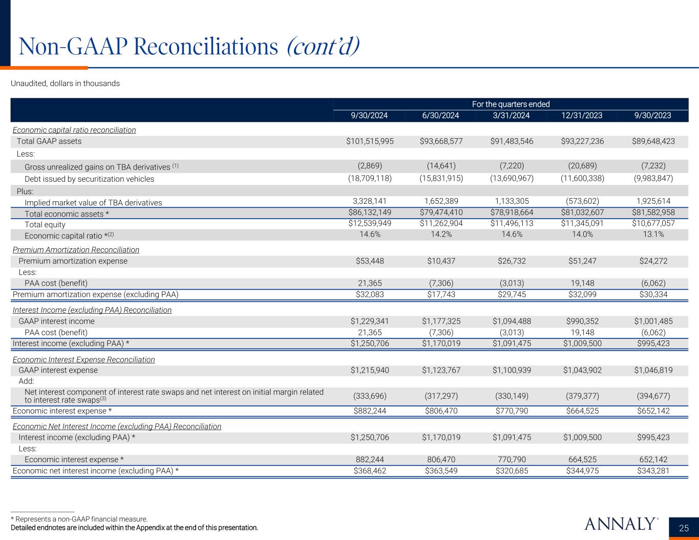 Non-GAAP Reconciliations (cont’d) 24 Unaudited, dollars in thousands * Represents a non-GAAP financial measure. For the quarters ended 9/30/2024 6/30/2024 3/31/2024 12/31/2023 9/30/2023 Economic leverage ratio reconciliation Repurchase agreements $64,310,276 $60,787,994 $58,975,232 $62,201,543 $64,693,821 Other secured financing 600,000 600,000 600,000 500,000 500,000 Debt issued by securitization vehicles 18,709,118 15,831,915 13,690,967 11,600,338 9,983,847 Participations issued 467,006 1,144,821 1,161,323 1,103,835 788,442 U.S. Treasury securities sold, not yet purchased 2,043,519 1,974,602 2,077,404 2,132,751 — Total GAAP debt $86,129,919 $80,339,332 $76,504,926 $77,538,467 $75,966,110 Less non-recourse debt: Debt issued by securitization vehicles ($18,709,118) ($15,831,915) ($13,690,967) ($11,600,338) ($9,983,847) Participations issued (467,006) (1,144,821) (1,161,323) (1,103,835) (788,442) Total recourse debt $66,953,795 $63,362,596 $61,652,636 $64,834,294 $65,193,821 Plus / (Less): Cost basis of TBA derivatives $3,333,873 $1,639,941 $1,136,788 ($555,221) $1,965,117 Payable for unsettled trades 1,885,286 1,096,271 2,556,798 3,249,389 2,214,319 Receivable for unsettled trades (766,341) (320,659) (941,366) (2,710,224) (1,047,566) Economic debt * $71,406,613 $65,778,149 $64,404,856 $64,818,238 $68,325,691 Total equity $12,539,949 $11,262,904 $11,496,113 $11,345,091 $10,677,057 Economic leverage ratio * 5.7x 5.8x 5.6x 5.7x 6.4x