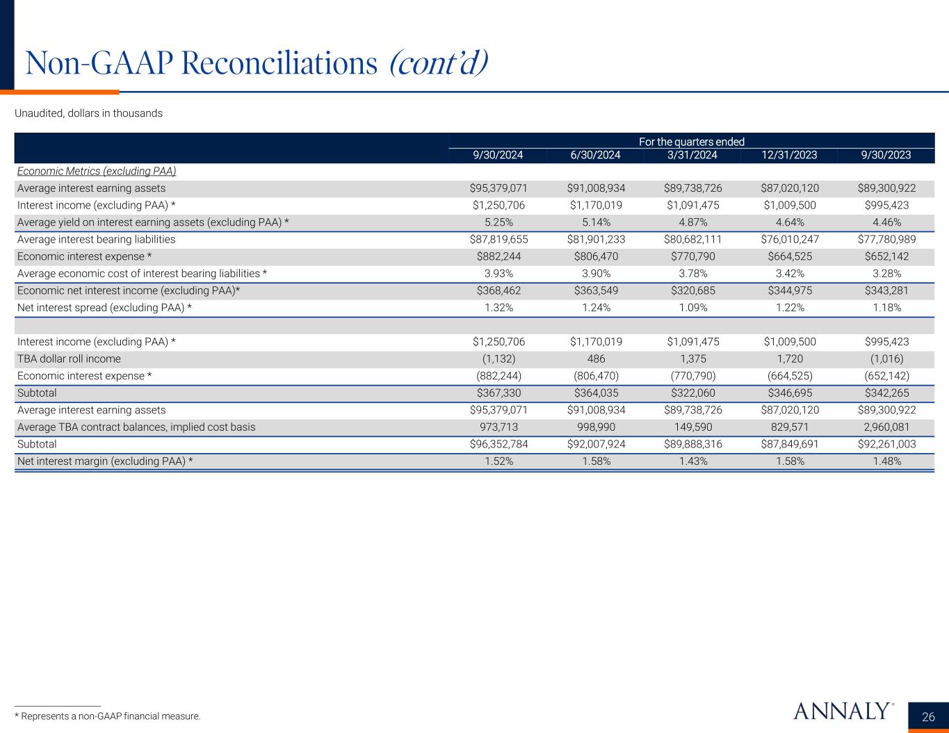 Non-GAAP Reconciliations (cont’d) 25 Unaudited, dollars in thousands For the quarters ended 9/30/2024 6/30/2024 3/31/2024 12/31/2023 9/30/2023 Economic capital ratio reconciliation Total GAAP assets $101,515,995 $93,668,577 $91,483,546 $93,227,236 $89,648,423 Less: Gross unrealized gains on TBA derivatives (1) (2,869) (14,641) (7,220) (20,689) (7,232) Debt issued by securitization vehicles (18,709,118) (15,831,915) (13,690,967) (11,600,338) (9,983,847) Plus: Implied market value of TBA derivatives 3,328,141 1,652,389 1,133,305 (573,602) 1,925,614 Total economic assets * $86,132,149 $79,474,410 $78,918,664 $81,032,607 $81,582,958 Total equity $12,539,949 $11,262,904 $11,496,113 $11,345,091 $10,677,057 Economic capital ratio *(2) 14.6% 14.2% 14.6% 14.0% 13.1% Premium Amortization Reconciliation Premium amortization expense $53,448 $10,437 $26,732 $51,247 $24,272 Less: PAA cost (benefit) 21,365 (7,306) (3,013) 19,148 (6,062) Premium amortization expense (excluding PAA) $32,083 $17,743 $29,745 $32,099 $30,334 Interest Income (excluding PAA) Reconciliation GAAP interest income $1,229,341 $1,177,325 $1,094,488 $990,352 $1,001,485 PAA cost (benefit) 21,365 (7,306) (3,013) 19,148 (6,062) Interest income (excluding PAA) * $1,250,706 $1,170,019 $1,091,475 $1,009,500 $995,423 Economic Interest Expense Reconciliation GAAP interest expense $1,215,940 $1,123,767 $1,100,939 $1,043,902 $1,046,819 Add: Net interest component of interest rate swaps and net interest on initial margin related to interest rate swaps(3) (333,696) (317,297) (330,149) (379,377) (394,677) Economic interest expense * $882,244 $806,470 $770,790 $664,525 $652,142 Economic Net Interest Income (excluding PAA) Reconciliation Interest income (excluding PAA) * $1,250,706 $1,170,019 $1,091,475 $1,009,500 $995,423 Less: Economic interest expense * 882,244 806,470 770,790 664,525 652,142 Economic net interest income (excluding PAA) * $368,462 $363,549 $320,685 $344,975 $343,281 * Represents a non-GAAP financial measure. Detailed endnotes are included within the Appendix at the end of this presentation.