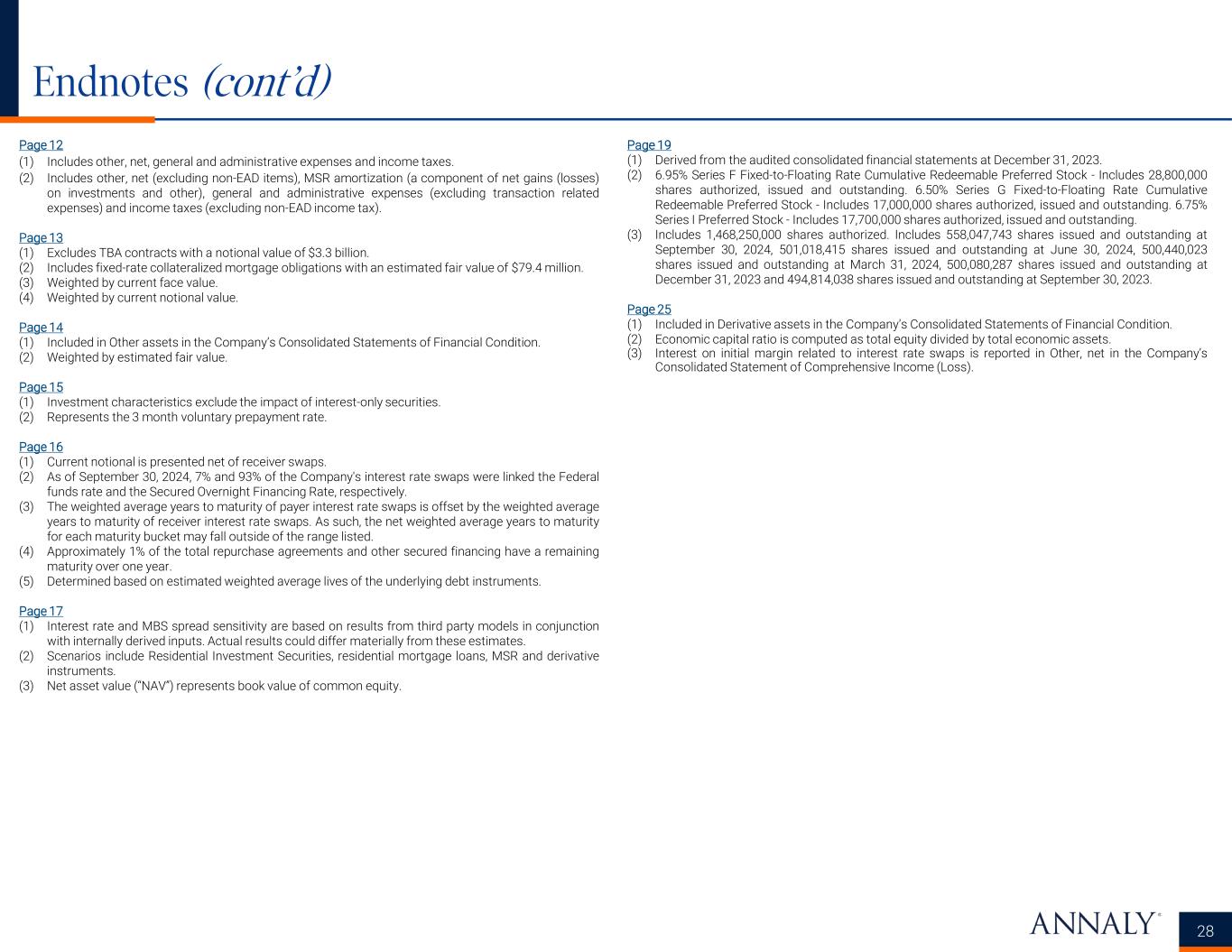 Endnotes 27 Page 3 (1) Net of dividends on preferred stock. (2) Annualized GAAP return (loss) on average equity annualizes realized and unrealized gains and (losses) which may not be indicative of full year performance, unannualized GAAP return (loss) on average equity is 0.69% and (0.08%) for the quarters ended September 30, 2024 and June 30, 2024, respectively. (3) GAAP leverage is computed as the sum of repurchase agreements, other secured financing, debt issued by securitization vehicles, participations issued and U.S. Treasury securities sold, not yet purchased divided by total equity. Economic leverage is computed as the sum of recourse debt, cost basis of to-be-announced ("TBA") derivatives outstanding, and net forward purchases (sales) of investments divided by total equity. Recourse debt consists of repurchase agreements, other secured financing, and U.S. Treasury securities sold, not yet purchased. Debt issued by securitization vehicles and participations issued are non-recourse to the Company and are excluded from economic leverage. (4) GAAP capital ratio is computed as total equity divided by total assets. Economic capital ratio is computed as total equity divided by total economic assets. Total economic assets include the implied market value of TBA derivatives and are net of debt issued by securitization vehicles. (5) Net interest margin represents interest income less interest expense divided by average interest earning assets. Net interest margin (excluding PAA) represents the sum of the Company's interest income (excluding PAA) plus TBA dollar roll income less interest expense and the net interest component of interest rate swaps divided by the sum of average interest earning assets plus average TBA contract balances. (6) Average yield on interest earning assets represents annualized interest income divided by average interest earning assets. Average interest earning assets reflects the average amortized cost of our investments during the period. Average yield on interest earning assets (excluding PAA) is calculated using annualized interest income (excluding PAA). (7) Average GAAP cost of interest bearing liabilities represents annualized interest expense divided by average interest bearing liabilities. Average interest bearing liabilities reflects the average balances during the period. Average economic cost of interest bearing liabilities represents annualized economic interest expense divided by average interest bearing liabilities. Page 5 (1) Consists of common stock, additional paid-in capital, accumulated other comprehensive income (loss) and accumulated deficit. (2) Utilizes an actual/360 factor. (3) The average and period-end rates are net of reverse repurchase agreements. Without netting reverse repurchase agreements, the average rate and the period-end rate was unchanged for each period. (4) Measures total notional balances of interest rate swaps, interest rate swaptions (excluding receiver swaptions), futures and U.S. Treasury securities sold, not yet purchased, at fair value relative to repurchase agreements, other secured financing, cost basis of TBA derivatives outstanding and net forward purchases (sales) of investments; excludes MSR and the effects of term financing, both of which serve to reduce interest rate risk. Additionally, the hedge ratio does not take into consideration differences in duration between assets and liabilities. Page 6 (1) Economic interest expense is comprised of GAAP interest expense, the net interest component of interest rate swaps, and, beginning with the quarter ended June 30, 2024, net interest on initial margin related to interest rate swaps, which is reported in Other, net in the Company’s Consolidated Statement of Comprehensive Income (Loss). Prior period results have not been adjusted in accordance with this change as the impact is not material. Net interest on variation margin related to interest rate swaps was previously and is currently included in the Net interest component of interest rate swaps in the Company’s Consolidated Statement of Comprehensive Income (Loss) for all periods presented. (2) Net of dividends on preferred stock. Page 7 (1) Includes dividend equivalents on share-based awards. (2) Annualized GAAP return (loss) on average equity annualizes realized and unrealized gains and (losses) which may not be indicative of full year performance, unannualized GAAP return (loss) on average equity is 0.69%, (0.08%), 4.07%, (3.55%) and (5.04%) for the quarters ended September 30, 2024, June 30, 2024, March 31, 2024, December 31, 2023 and September 30, 2023, respectively. Page 8 (1) Interest on initial margin related to interest rate swaps is reported in Other, net in the Company’s Consolidated Statement of Comprehensive Income (Loss). Page 9 (1) Includes write-downs or recoveries on investments which are reported in Other, net in the Company's Consolidated Statement of Comprehensive Income (Loss). (2) The adjustment to add back Net (gains) losses on derivatives does not include the net interest component of interest rate swaps which is reflected in earnings available for distribution. The net interest component of interest rate swaps totaled $317.5 million, $298.4 million, $330.1 million, $379.4 million and $394.7 million for the quarters ended September 30, 2024, June 30, 2024, March 31, 2024, December 31, 2023 and September 30, 2023, respectively. (3) The Company excludes non-EAD (income) loss allocated to equity method investments, which represents the unrealized (gains) losses allocated to equity interests in a portfolio of MSR, which is reported in Other, net in the Company’s Consolidated Statement of Comprehensive Income (Loss). (4) All quarters presented include costs incurred in connection with securitizations of residential whole loans. (5) TBA dollar roll income represents a component of Net gains (losses) on derivatives. (6) MSR amortization utilizes purchase date cash flow assumptions and actual 