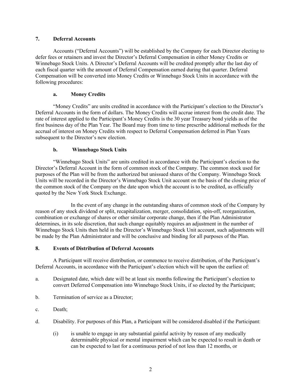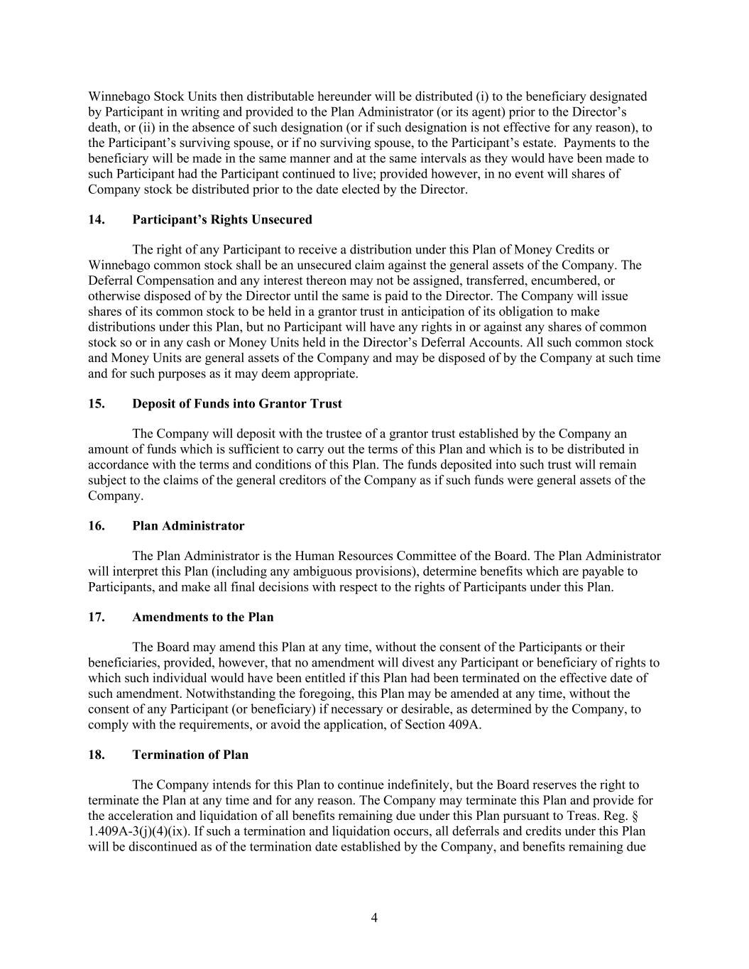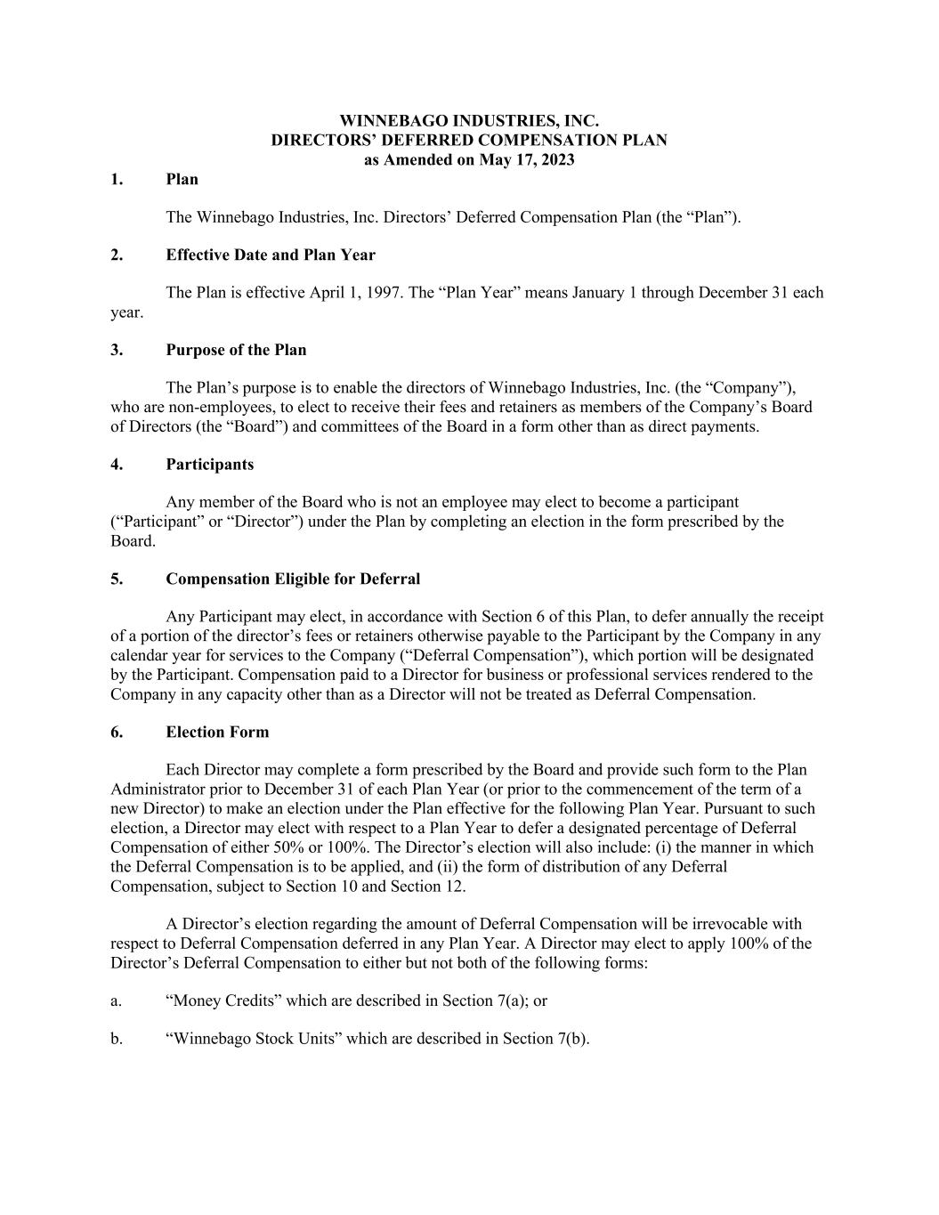 The Board of Directors (the “Board”) of Winnebago Industries, Inc. (the “Company”) has adopted this Mandatory Compensation Recovery Policy (this “Policy”) pursuant to Rule 10D-1 of the Securities and Exchange Act of 1934, as amended (the “Exchange Act”), the Securities and Exchange Commission (“SEC”) regulations promulgated thereunder, and applicable New York Stock Exchange (“NYSE”) listing standards. Subject to and in accordance with the terms of this Policy, upon a Recoupment Event, each Covered Executive shall be obligated to return to the Company, reasonably promptly, the amount of Erroneously Awarded Compensation that was received by such Covered Executive during the Lookback Period.