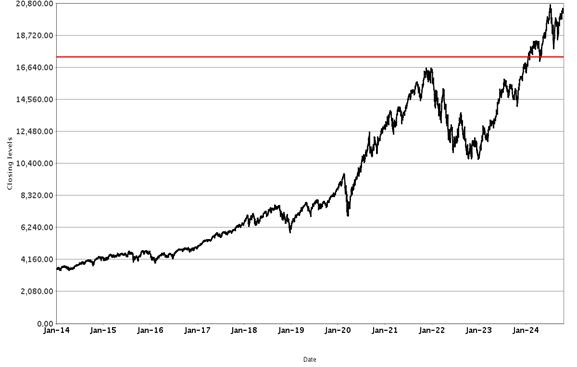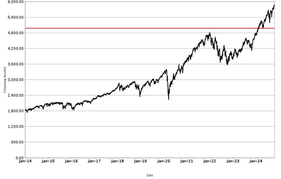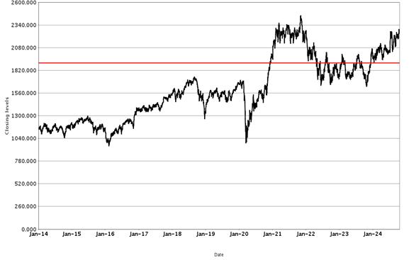 The following graphs set forth historical closing values of the Underlier for each offering for the period from January 1, 2014 to October 21, 2024. Each red line represents the Buffer Value. We obtained the information in the graphs from Bloomberg Financial Markets, without independent investigation. We cannot give you assurance that the performance of the Underlier will result in the return of all of your initial investment.
